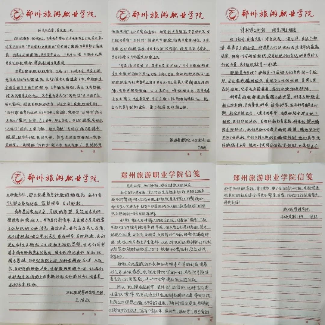旅游管理学院通过防范邪教宣传月系列活动,科普反邪教知识,引导学生学会甄别邪教特点,远离邪教,防止校园传教,坚决抵制和防范非法宗教渗透校园,提高了师生识邪、辨邪、拒邪、防邪的意识和能力,为构建和谐校园环境贡献出自己的力量。