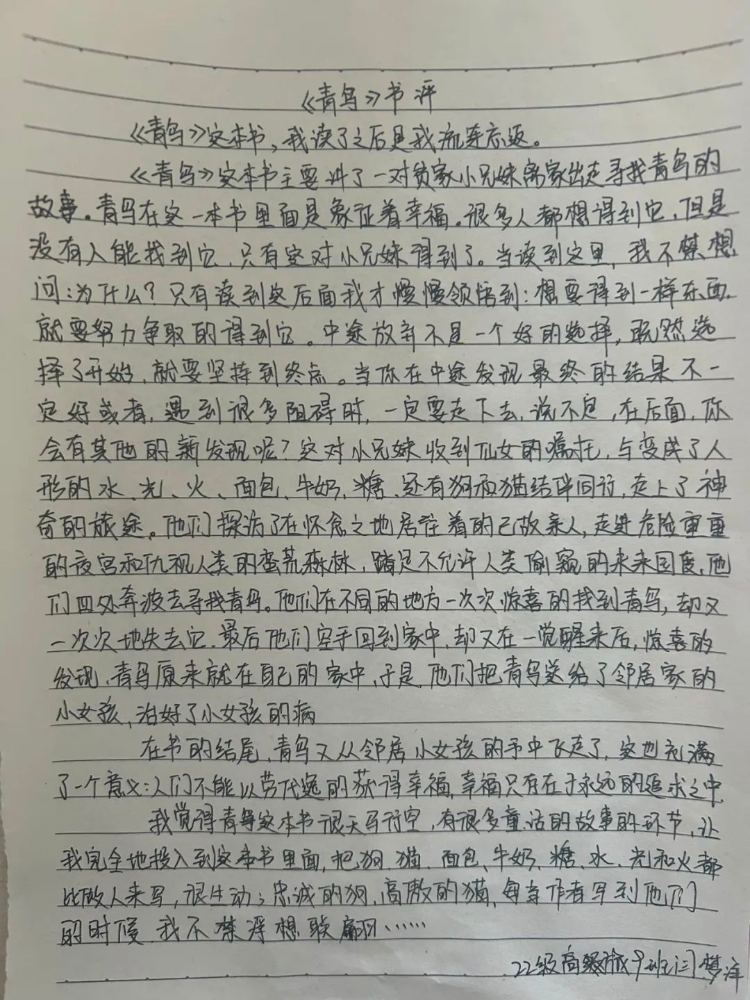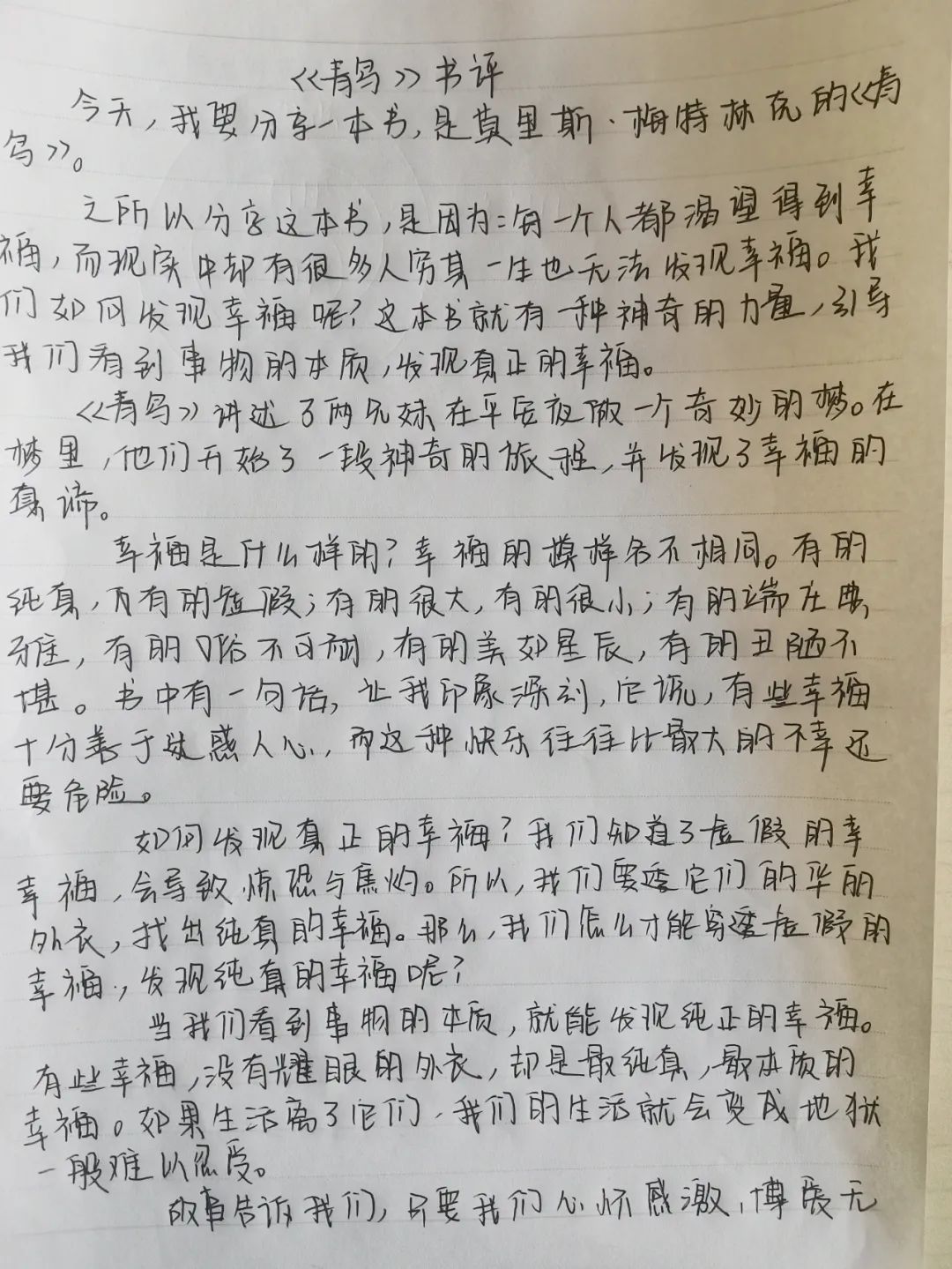 《青鸟》这一本书主要讲了一对贫家小兄妹离家出走寻找青鸟的故事。青鸟在这一本书里面是象征着幸福。很多人都想得到它,但是没有人能找到它,只有这对小兄妹得到了。当读到这里时,我不禁想问:为什么?