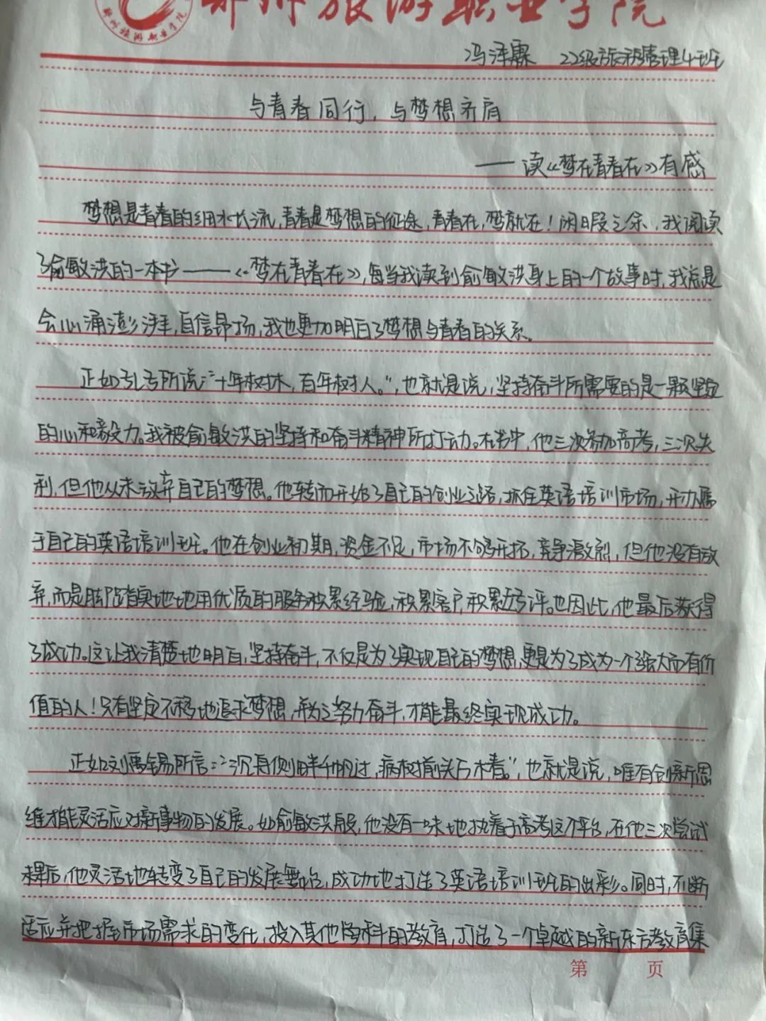 读完《梦在青春在》,我心中对俞敏洪的敬畏之情油然而生,他的故事激励着我坚持自己的梦想,勇敢面对困难,并努力为之奋斗,他身上的宝贵精神指引着我在青春的时光里追逐梦想,不断地充实自己的人生,永怀赤子之心,与青春同行,与梦想齐肩!