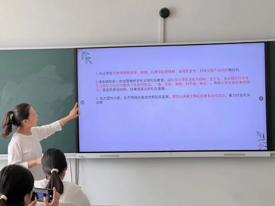 会上,朱臣臣针对各班级的礼仪工作进行了全面详尽的汇总与评述。她对礼仪负责人所付出的辛勤努力表示感谢。随后,她强调了礼仪值周工作的意义及具体要求。她表示,该项工作不仅是对学生礼仪素养的检验,更是对学院整体风貌的直接体现。她要求各班级礼仪委员必须严格履行职责,恪守礼仪规范,确保值周工作的顺利进行。同时,她提醒大家要及时纠正同学们带食物进教学楼、抽烟、在教学区穿拖鞋、染夸张发色、日常见面不说问好等不文明行为,并在日常学习生活中使用“请、你好、谢谢、对不起、再见”的十字文明用语,营造优良的礼仪氛围。