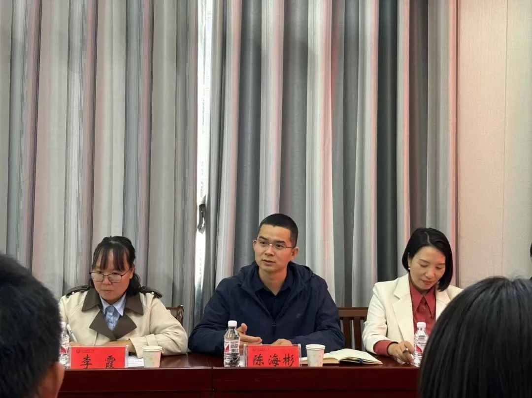 首先,信阳师范大学数学与统计学院党委书记张楠对陈海彬一行的到来表示热烈欢迎,她从数学与统计学院历史沿革讲起,详细介绍了学院党建工作的基本情况和取得的系列成绩。而后,数学与统计学院副院长、数学研究所党支部书记韩英波分别介绍了支部党建工作基本情况、全国样板党支部建设的总体思路、建设举措和经验做法等。紧接着,学院党委副书记韩文鹏从辅导员个人发展、辅导员工作室创建、学生活动品牌、专业+职业、活动+竞赛等方面讲述了学生工作情况,并重点介绍了“一个中心、两个支点、三股力量、四项制度”的学生工作模式,助力我院将党建工作与学生工作提升凝练,形成特色品牌模式。