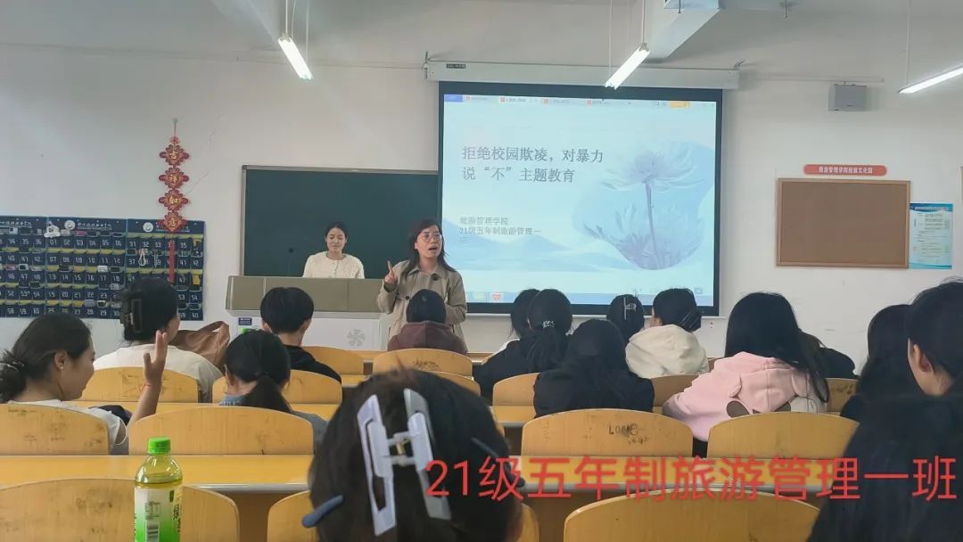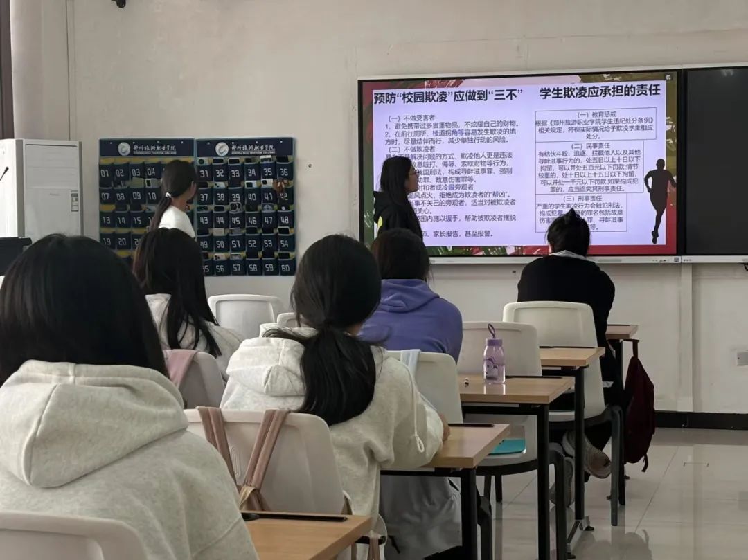 为预防校园欺凌事件的发生,建设平安和谐的校园,10月27日,郑州旅院旅游管理学院组织召开“拒绝校园欺凌,对暴力说‘不’”主题班会,班会由各班班主任主持。