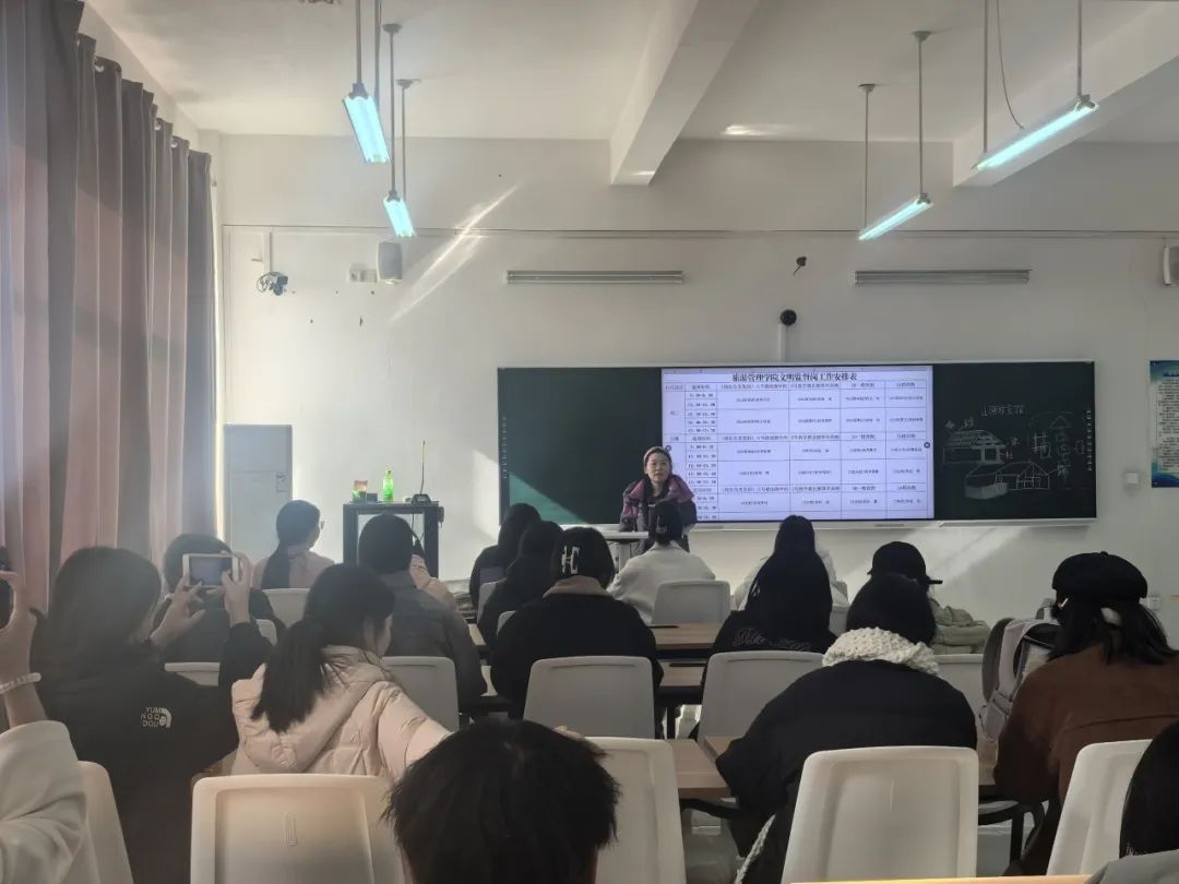 为进一步加强和提升学生日常管理和思想教育工作,营造和谐文明的校园文化氛围,引导学生形成自觉践行文明礼仪、遵守校规校纪的新风尚。旅游管理学院于11月26日在5B207组织召开校园文明监督岗培训会。会议由专职辅导员朱臣臣老师主持,各班文明礼仪负责人参加。