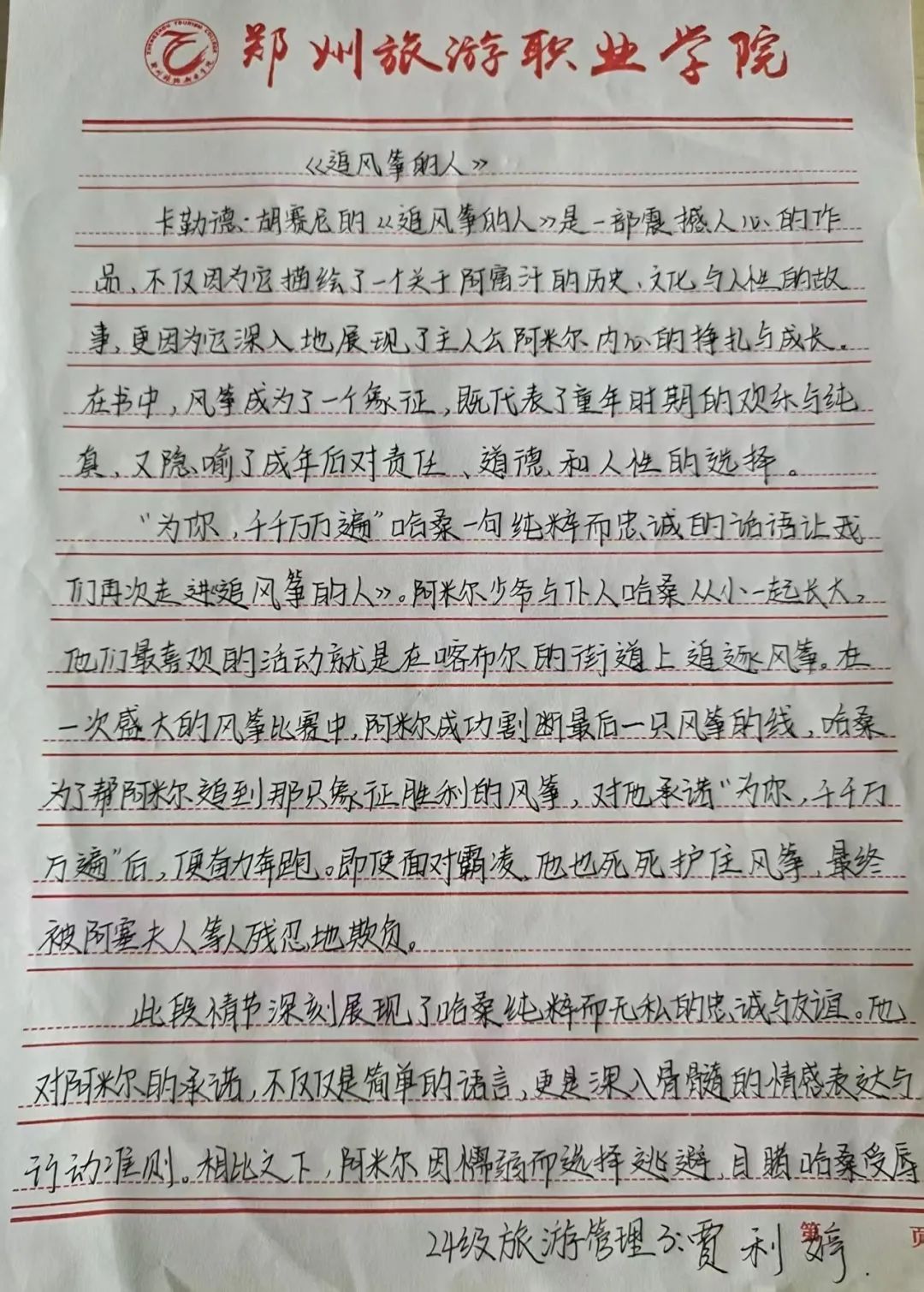 《追风筝的人》让我懂得许多道理,认识到友谊的珍贵、忠诚的力量、勇气的重要性和救赎的意义。在生活中,我们时常犯错,会面临各种困难与选择,也会感到无助和无力。但只要有勇敢面对困难的决心,就一定能找到属于自己的 “风筝”。