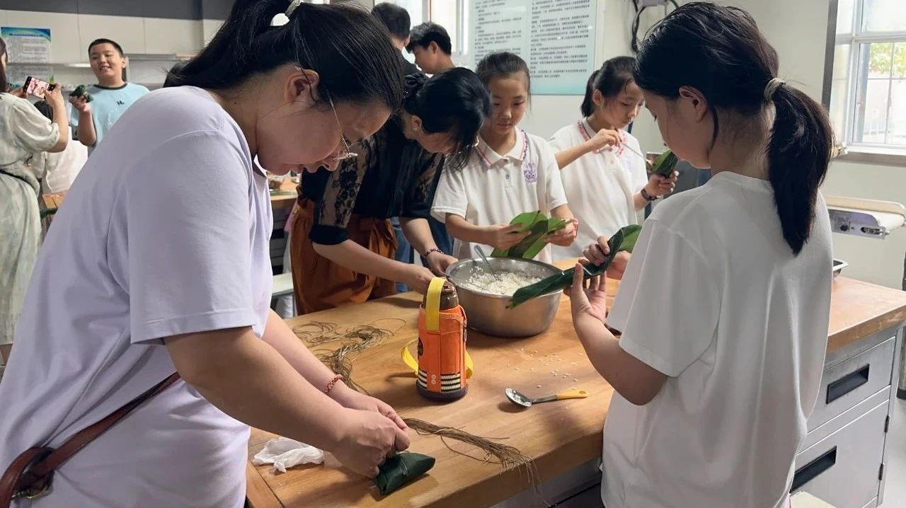 活动中,教职工和孩子们被分为六组,每组四五人,大家围坐在一起,互相学习、协作包粽子。小朋友们兴致勃勃,在家长的指导下,小心翼翼地折叠粽叶、填充馅料、捆扎绳子;大朋友们则耐心示范,分享包粽子的技巧。现场欢声笑语不断,粽叶的清香与甜蜜的馅料交织,营造出浓厚的节日氛围。