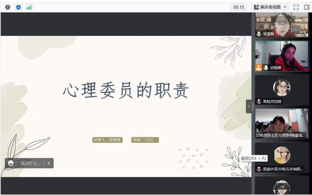 为帮助2022级新生心理委员尽快熟悉工作角色,了解工作职责,进入工作节奏,普及心理健康知识,提升心理委员工作技能。10月25日晚,在学校心理健康教育中心的安排下,皮晓媛老师通过线上平台开展了2022年心理委员培训第二讲——《心理委员的职责》,旅游管理学院组织全体学生会心安部成员、2022级班级心理委员参加了此次培训会。