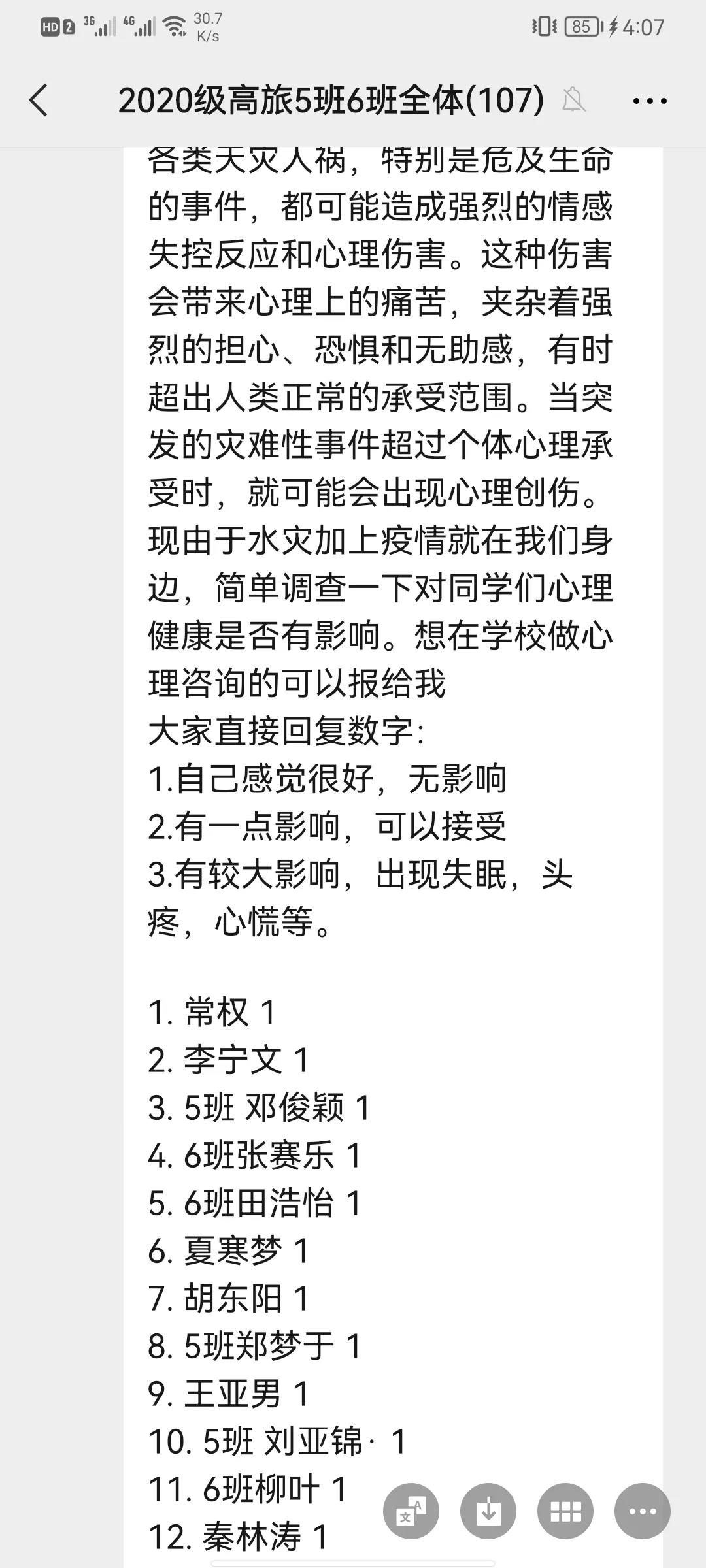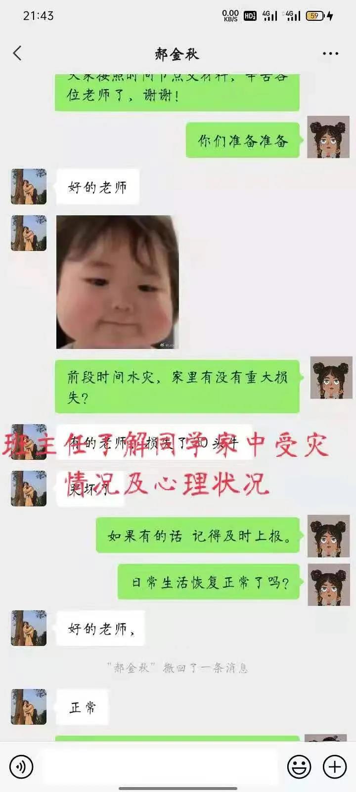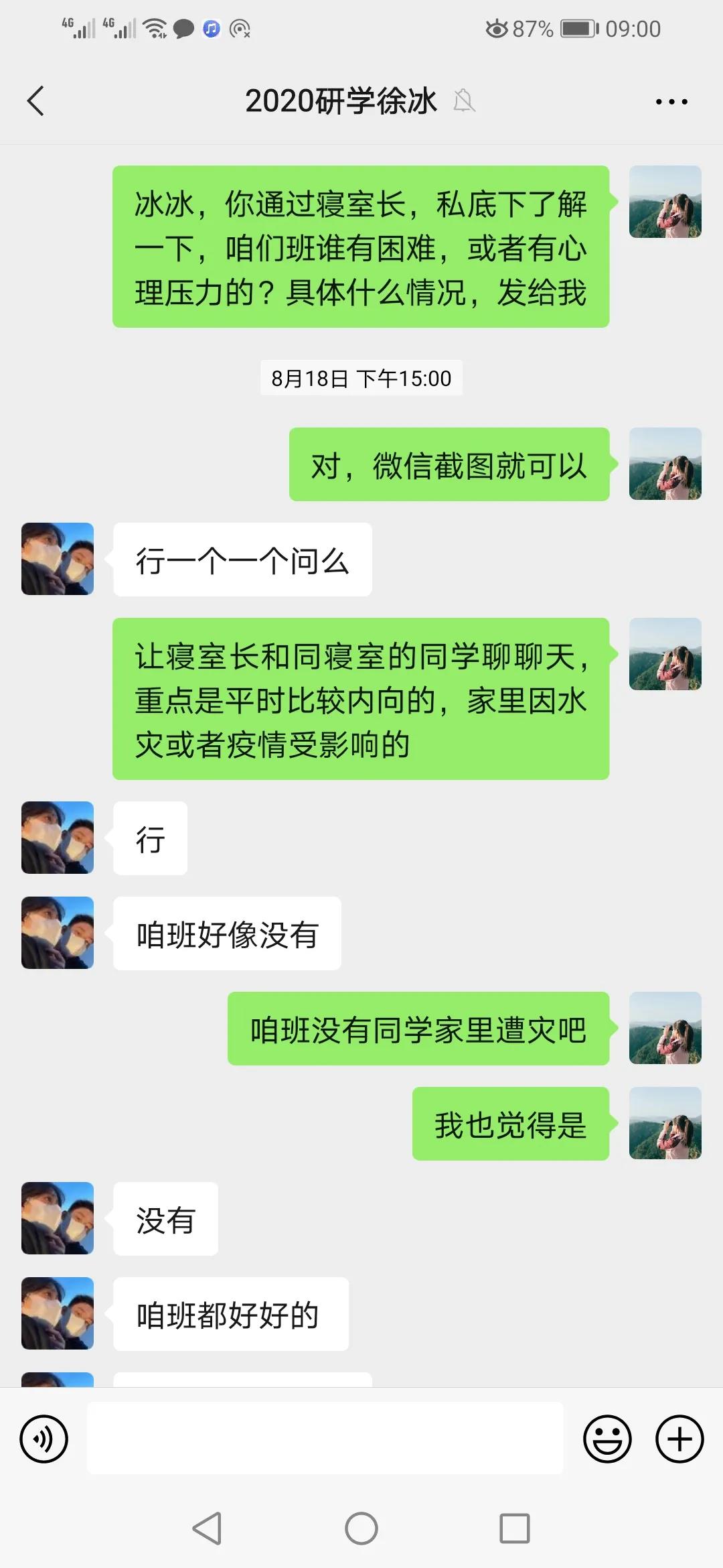 此次心理排查以班级为单位,由各班班主任老师负责,通过召开班会、发布问卷、召开线上班委会议、宿舍摸排等途径,坚决不漏掉每一个学生,全面细致地开展工作。排查的重点对象主要包括因洪涝灾害家庭受损的学生和处于疫情中高风险地区的学生;排查内容主要围绕学生近期的心理状况,是否因汛情和疫情的影响而产生害怕、焦虑、无助、恐惧、愤怒等负面情绪和心理体验。通过排查筛选出需要重点关注的学生,班主任备案记录在册,展开了有针对性地心理疏导和帮扶,帮助学生疏导负面情绪,给予精神支持。此外,对于因洪涝灾害家庭受损严重的学生,班主任、辅导员老师积极帮助学生提交资助补贴申请,努力帮学生减轻心理负担和精神压力。