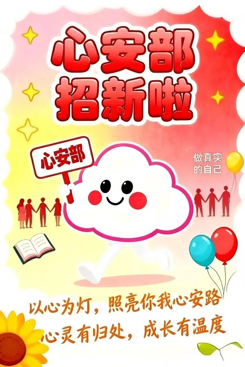 大学之旅,从“心”起航!心安部围绕“预防为主、干预为辅、赋能成长”的工作理念,为全院学子提供专业、贴心的心理支持服务。致力于打造不用“端着”的小天地,只需带着真实的自己和大家一起化解焦虑、积蓄力量,让校园生活充满活力。“心”之所向,“安”之所往,旅游管理学院心安部期待你的到来!
