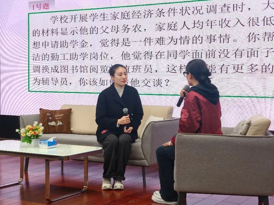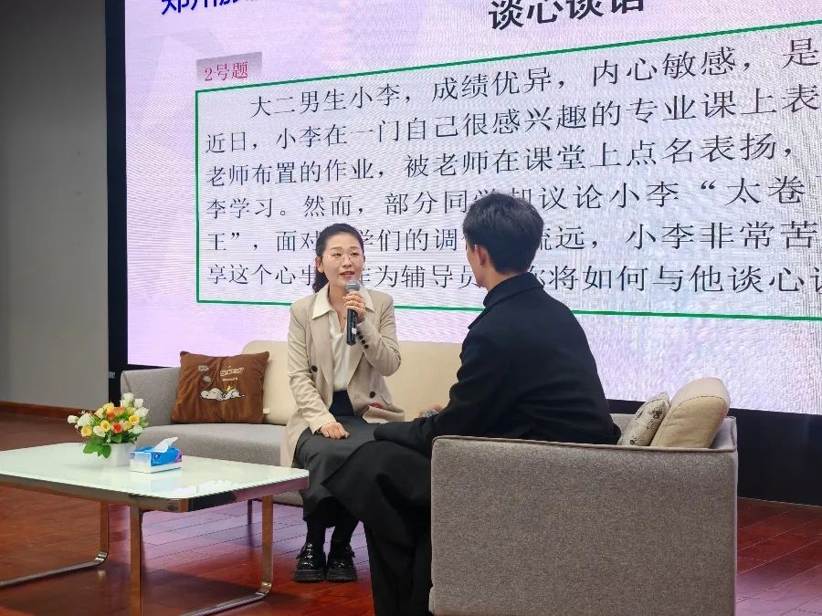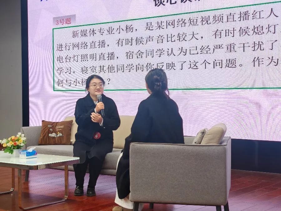 谈心谈话(决赛)比赛现场模拟真实场景,根据现场题目要求,辅导员与助演学生进行面对面交流,以情景再现的方式开展谈心谈话。现场,面对学生的一个个问题,辅导员以情动人,以理服人,参演学生充分发挥机智,选手灵活应对,赢得现场阵阵掌声。