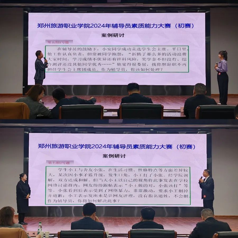 案例研讨(初赛)比赛中,来自各学院的16名辅导员两两组队,通过抽签随机选题,以“我提问,你回答”的方式展开研讨,充分考察辅导员在分析问题、研判问题和解决问题方面的能力。案例题目选取自辅导员日常工作中常见的学生问题,涉及网络不良言论、情感纠葛、寝室矛盾、心理健康、网络诈骗等方面。选手们结合自身的工作经历围绕案例进行了案例分析、对策研讨和经验总结。
