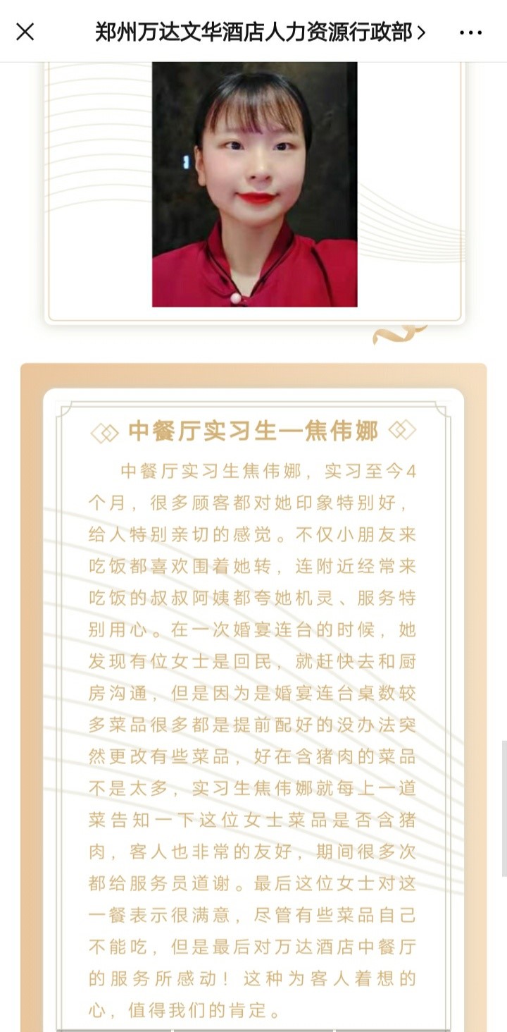 焦伟娜在郑州富力万达文华酒店“典珍中餐厅”岗位实习,实习期间在十月份被评为“优秀实习生”,由于在工作中和同事及上下级友好相处,在酒店十月份面临着LRA及EA的用餐体验时领导积极推选出她参加服务,在有新的同事入职时推荐焦伟娜担任“小师傅”带领新员工学习中餐厅服务标准,在“小师傅”讲解和带领下,她的徒弟也能快速适应工作岗位和进入服务角色,经常收到客人的“表扬信”。