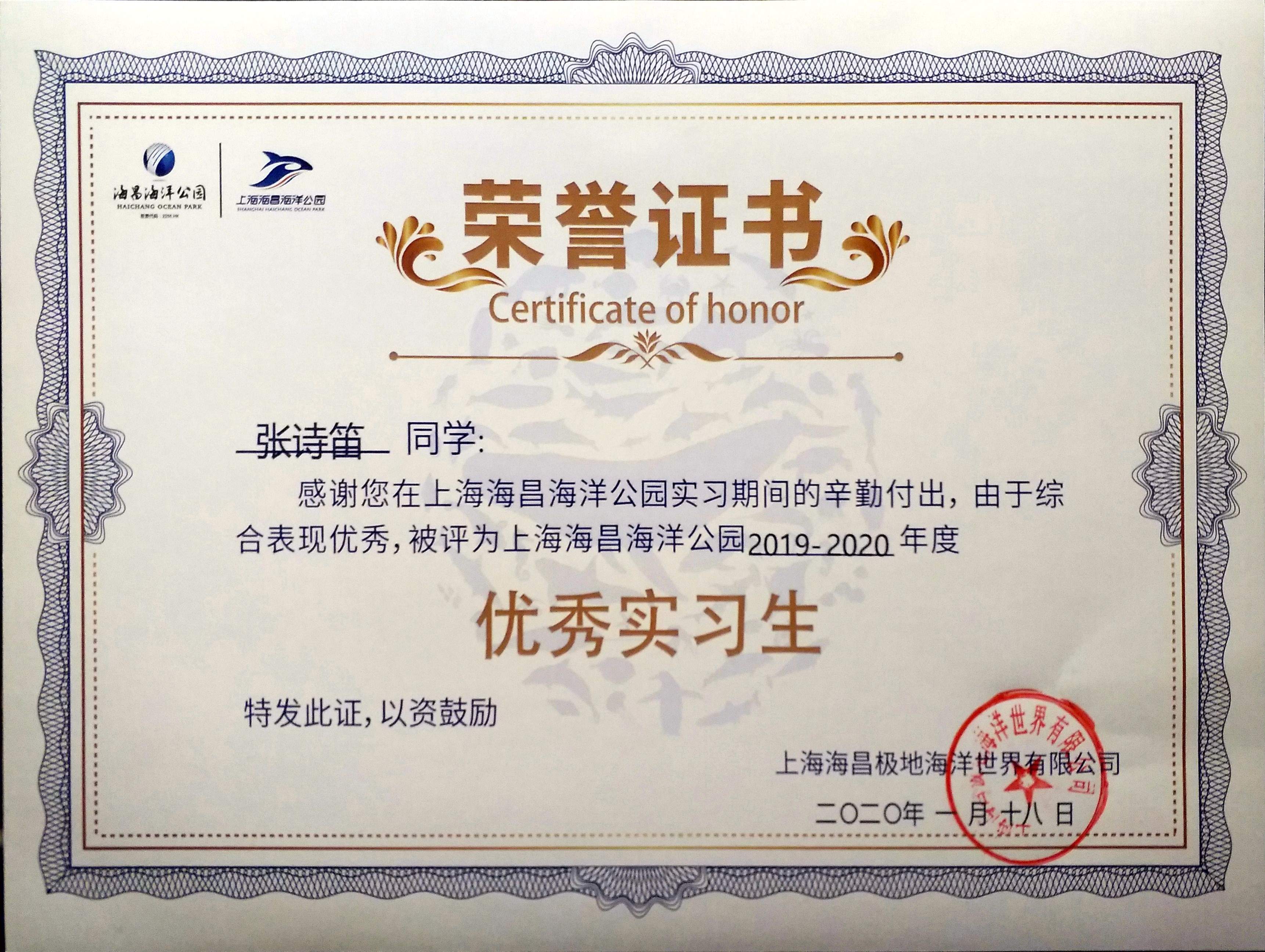 张诗笛在上海海昌极地海洋世界有限公司,运营服务部乘玩科前场服务岗位实习期间,工作负责,肯学勤干,表现出良好的旅院学子敬业精神。由于积极参与公司及部门的各项员工活动,为人活泼开朗并与同事建立了深厚的友谊,张诗笛同学得到了上级领导及同事的肯定和赞扬。根据其优秀的综合表现,被评为上海海昌海洋公园2019-2020年度优秀实习生。