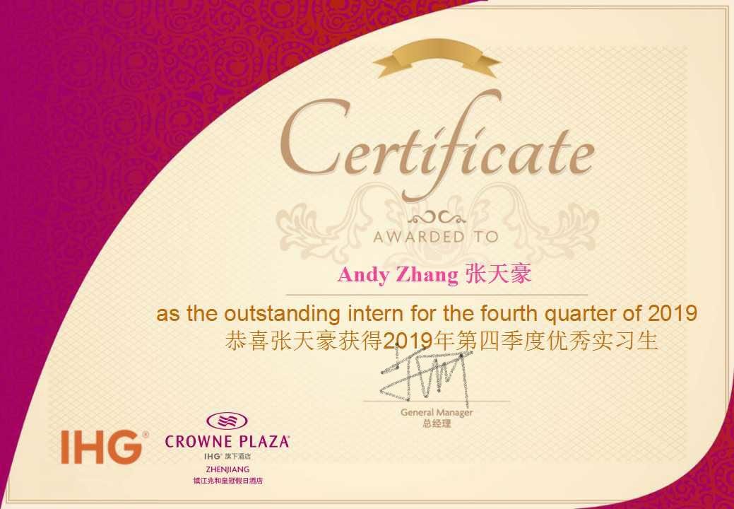 张天豪在镇江兆和皇冠假日酒店单位礼宾岗位实习期间,熟练掌握工作流程与岗位职责。在一次旋转门故障修复后,由于对旋转门操作熟练,在电脑上写下了操作门其具体操作流程,之后并专门为领导和员工进行了其旋转门操作流程的演示。在一次住客孩子的手不慎被电梯门夹伤后,由于大堂经理工作繁忙而抽不出时间,他主动带领客人到附近最近的医院治疗,从挂号到诊断,期间一直陪同客人与孩子,安抚客人情绪,得到了领导的认可和赞扬,获得了2019年第四季度优秀实习生荣誉称号