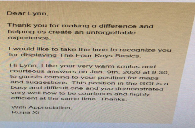 周琳,17级高旅五班,班主任闫芳芳老师。周琳在上海迪士尼度假区单位实习期间,在部门认真工作,积极主动。游客服务部门,是一个必须要有耐心的工作,因为每天都要面对游客,在迪士尼这样的工作环境中,她不仅要做到接受并满足游客的需求,还要把迪士尼的神奇带给每一个人。暑假期间游客多的情况下,分发地图不慌不忙,热情微笑面对每一位游客,在实习期间被园区领导发现后,当天发邮件给予表扬并发放“四好骑兵”荣誉称号。