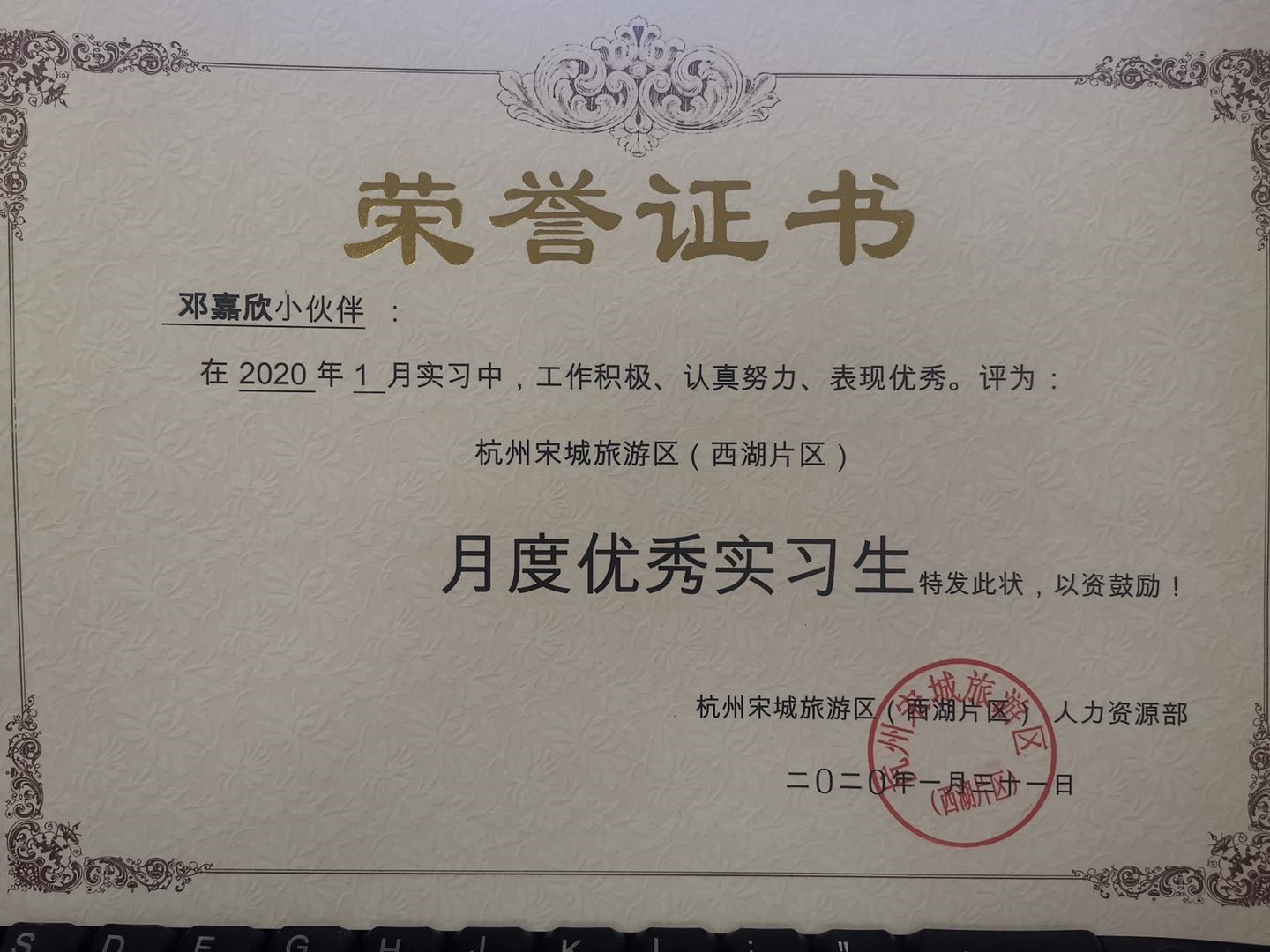 邓嘉欣,17级导游3班,班主任雷俊霞老师。邓嘉欣在杭州宋城演艺发展股份有限公司单位实习期间,在部门工作中始终以热情友好的态度对待工作。在岗期间,遇到腿脚不便的轮椅游客,会主动上前问好并推荐指引他们去观看演出,为游客设计并陪同游览景区;看到有游客在戏水区脚被擦伤时,主动上前询问伤情并提供碘伏和创可贴,在景区实习期间被评为优秀实习生。