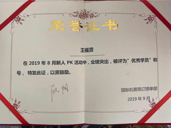 王福贤,17办公文案班,班主任谭霖老师。王福贤同学在苏州同程艺龙实习期间,在机票预订部门表现优秀,积极努力;在与客人沟通时能够做到耐心处理,客人在机场航班取消时着急出行时能帮助客人预订到机票出行,安抚客人急躁的情绪,做到换位思考;在遇到问题时能够及时和同事沟通学习,对工作认真负责,善于思考,能够举一反三,对安排的工作能够保质保量的完成工作任务。实习期间,未曾出现过无故缺勤,迟到早退现象,并且能与公司同事和睦相处,得到了公司领导的高度认可。