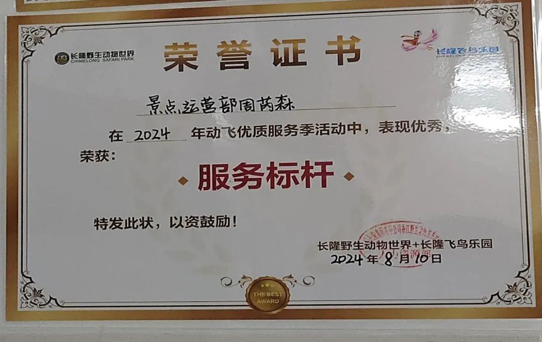 “各位游客朋友大家好,欢迎大家来到小火车乘游区,我是本趟小火车的讲解员,您接下来的旅程将全程由我陪同……”这是我作为小火车讲解员的经典开场白。作为一名讲解员,在工作中我以微笑招呼、礼让关注的特点对待游客,做到“八字服务方针”,在岗位上,我的科普讲解生动形象,言谈举止得体,多次获得了区长授予的“服务之星”称号,也得到了团队的认可,在2024年动飞“优秀服务季”中获得了“服务标杆”的荣誉证书。