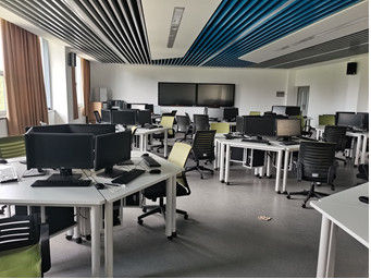 该实训室设施设备齐全,包括电脑、旅游网站管理平台、旅行社门店销售系统,触控一体机、服务器、交换机、实物实景展示台等,提供实训工位54个。