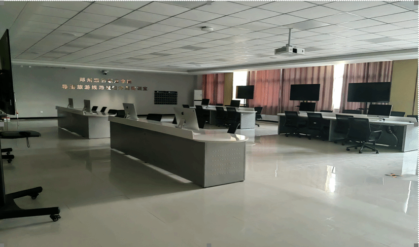 旅游线路规划实训室建成于2019年,面积176㎡,总投资75.5万元,是承担旅游线路规划设计、在线模拟考试任务的实践教学基地。