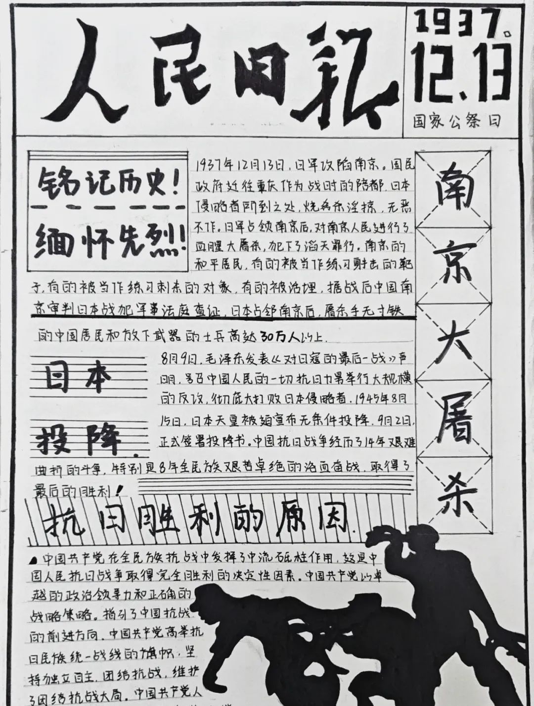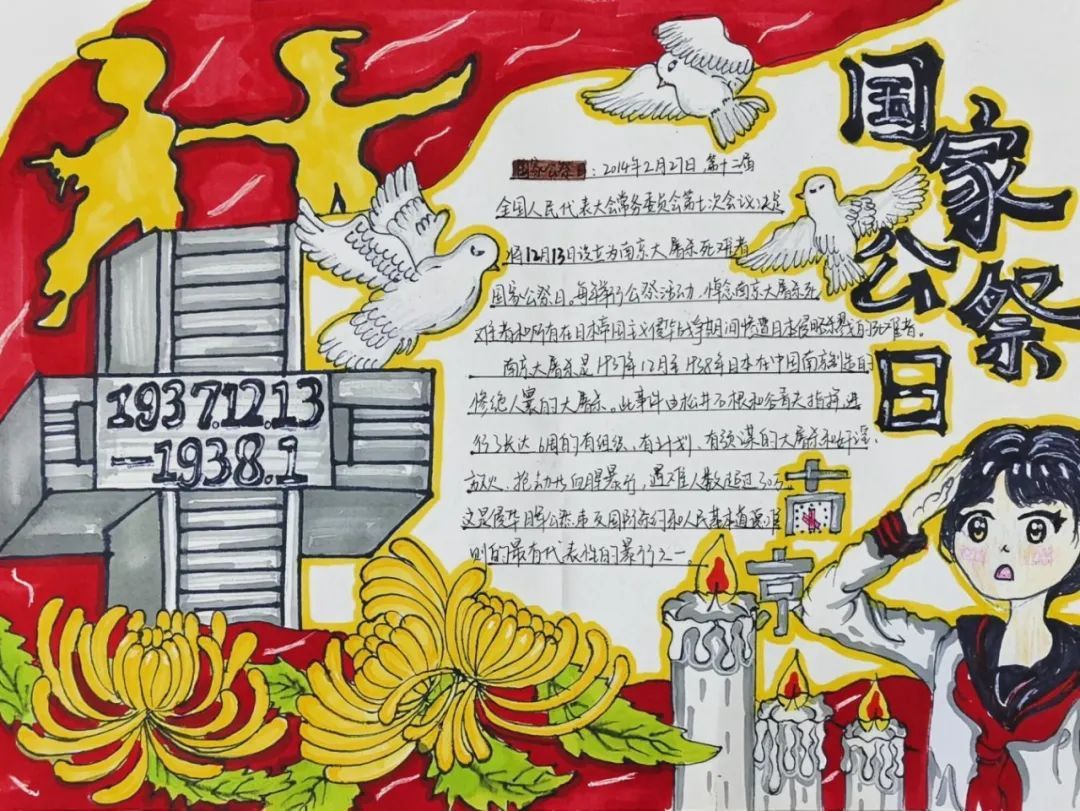 2024年12月13日,旅游管理学院组织学生开展国家公祭日手抄报活动,旨在通过手抄报的形式展现大众历史记忆,激发爱国热忱,鞭策众人以史为鉴,在各自岗位为和平、发展奋力前行,让悲剧永不复现。
