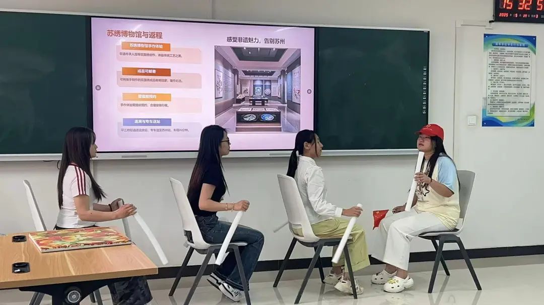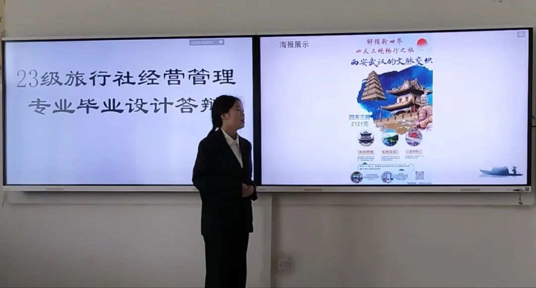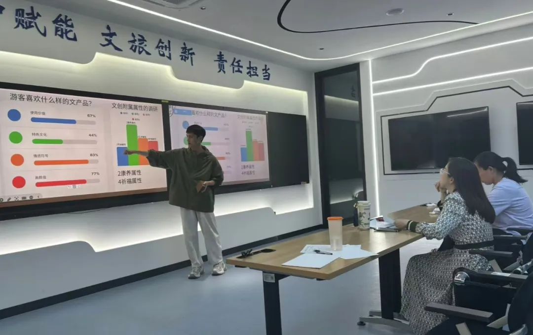 毕业设计制作团队在现场陈述过程中,除PPT展示外,还通过规划图纸、视频播放、文创创作和情景剧演绎等形式,演绎旅游产品和旅游服务全流程,充分展现职业素养。