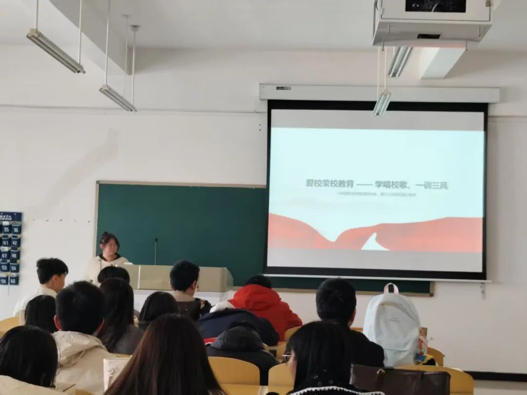 会上,班主任首先阐述爱校荣校理念,引导同学们理解其作为大学生成长成才的重要内容。随后进入校歌学唱环节,同学们在班主任组织下认真学唱《pp电子游戏平台网站校歌》,在激昂旋律中深化对学校的认同感。最后,开展"一训三风"专题学习,系统讲解校训校风的内涵,结合案例阐释其在校园文化建设中的核心作用,强调要将学校精神内化于心、外化于行,争做爱校荣校的示范者。