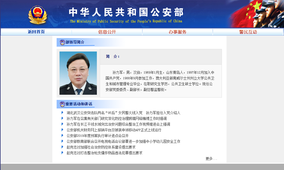 孙力军,男,汉族,1969年1月生,山东青岛人,1997年12月加入中国共产党,1988年9月参加工作,澳大利亚新南威尔士州州立大学公共卫生和城市管理专业毕业,在职研究生学历,公共卫生硕士学位。现任公安部党委委员、副部长,副总警监警衔。(简历摘自公安部官网)