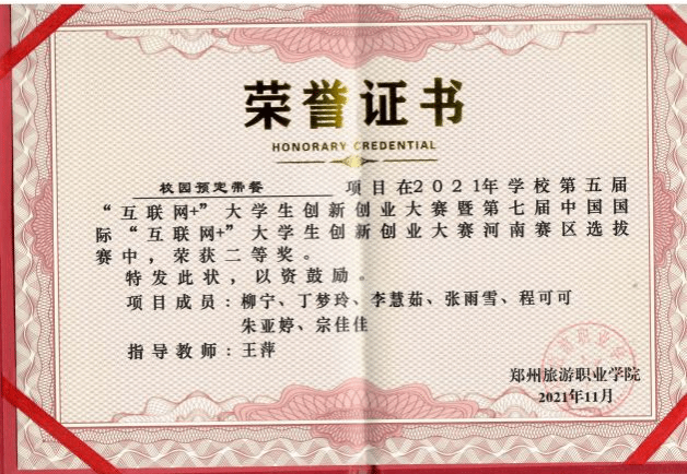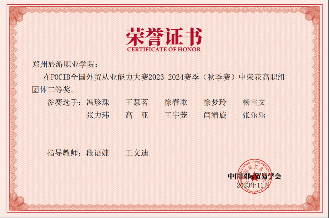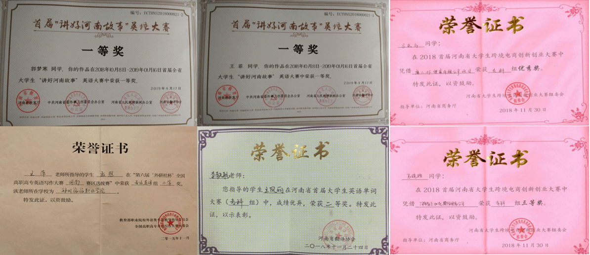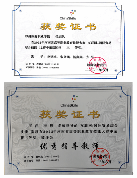 2022年,李延杰等四位同学获得河南省高等职业教育技能大赛互联网+国际贸易综合技能比赛中荣获团体三等奖,辅导教师王萍、李思