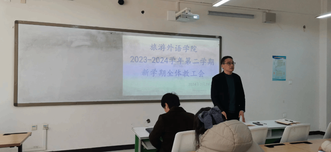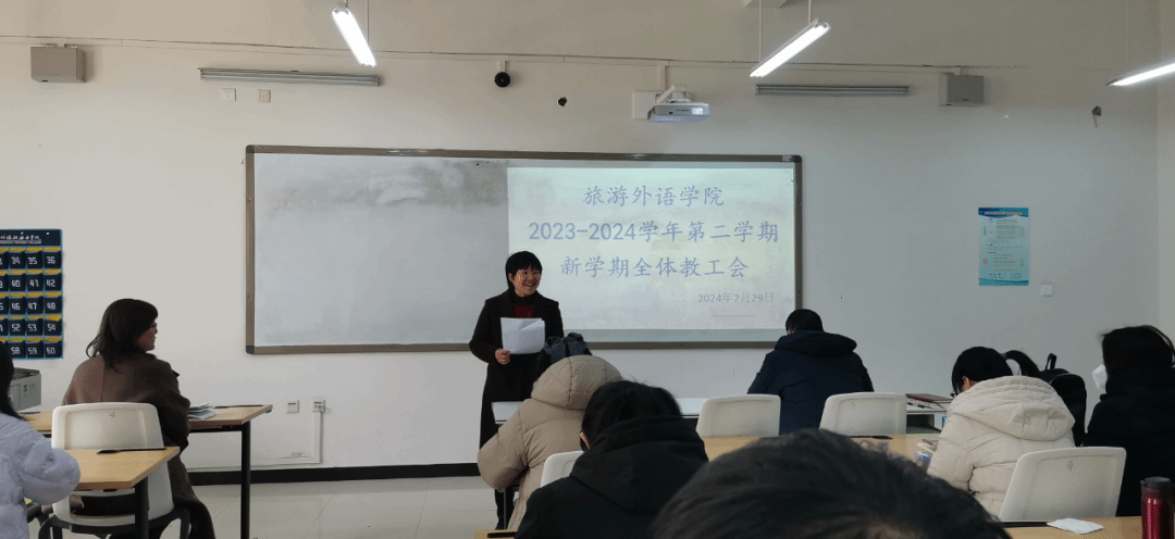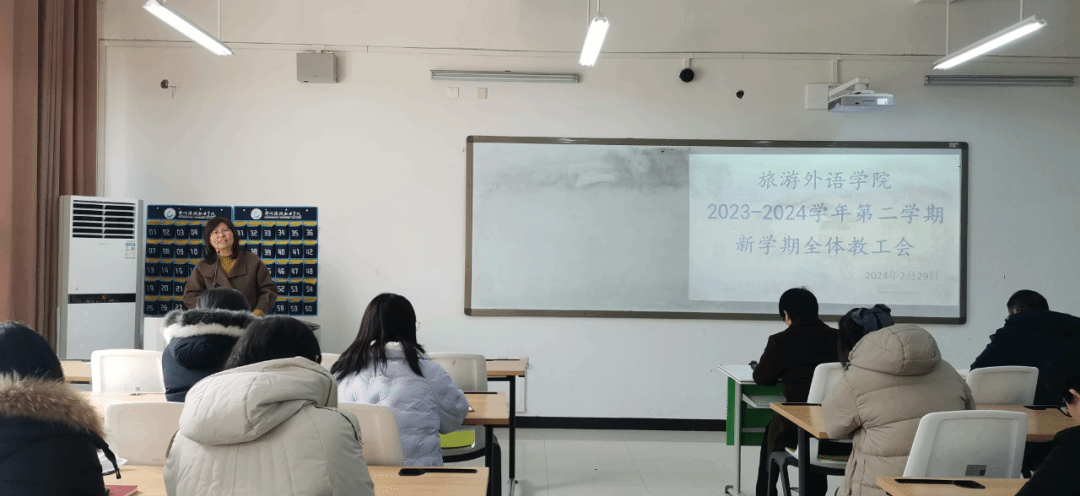 2月29日,旅游外语学院在清源楼207教室召开2023-2024学年第二学期新学期全体教工会。会议由旅游外语学院院长张贺玲主持,全体教职工参会。