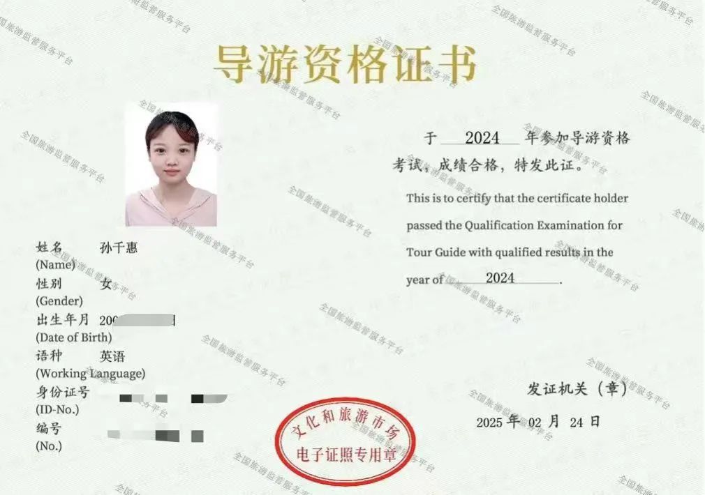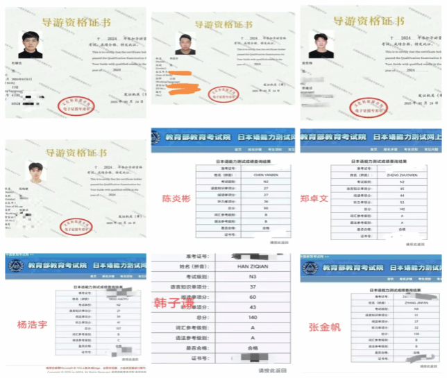 在全国导游证考试中,22级杜康佳、李浩宇同学考取了日语语种导游证;23级张瑞建、袁翌烽同学考取了普通话语种导游证;21级孙千慧同学考取了英语语种导游证。这些同学在考试中展现出的专业素养和应试能力,充分体现了他们在专业学习中的勤奋与执着。