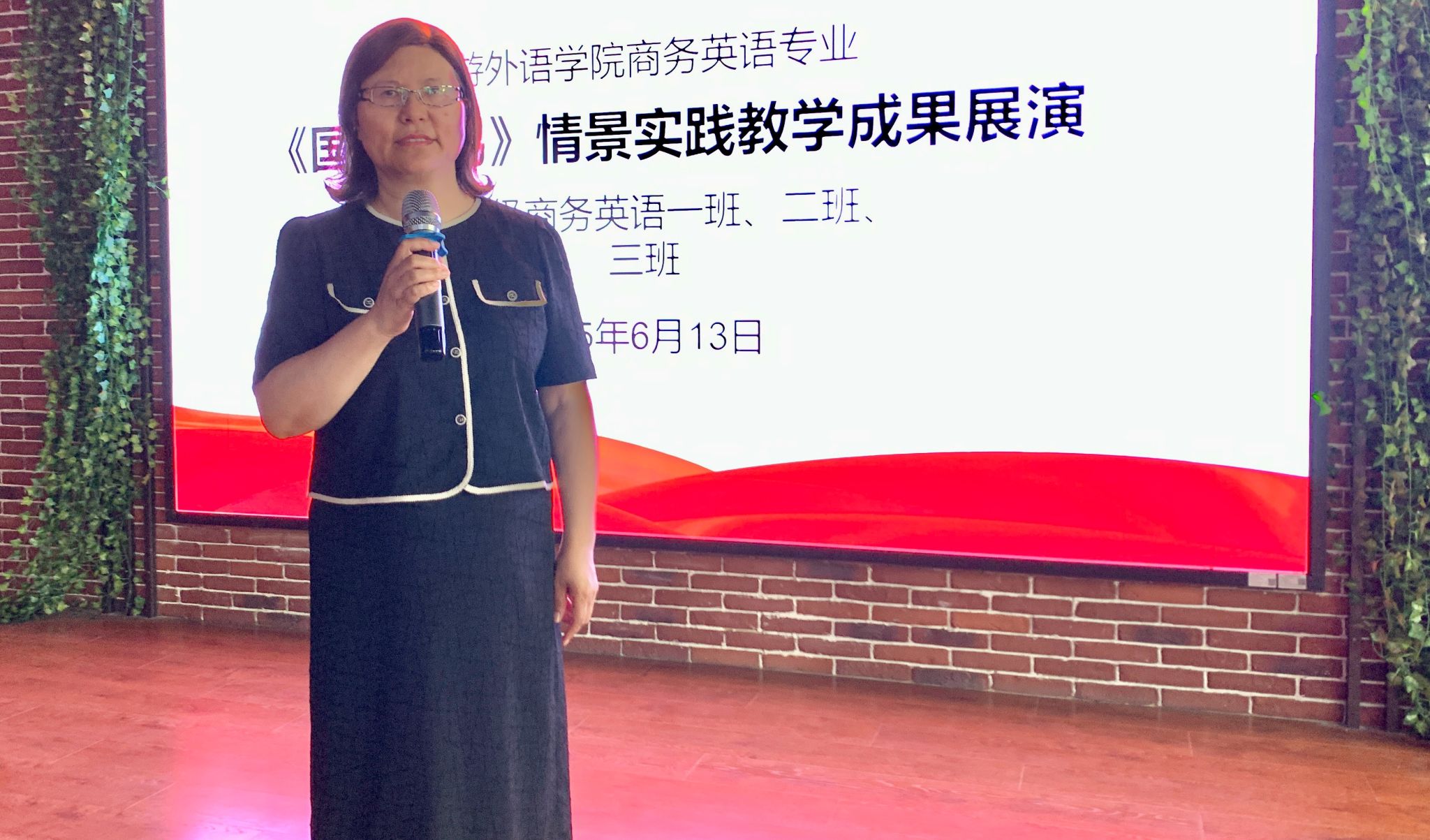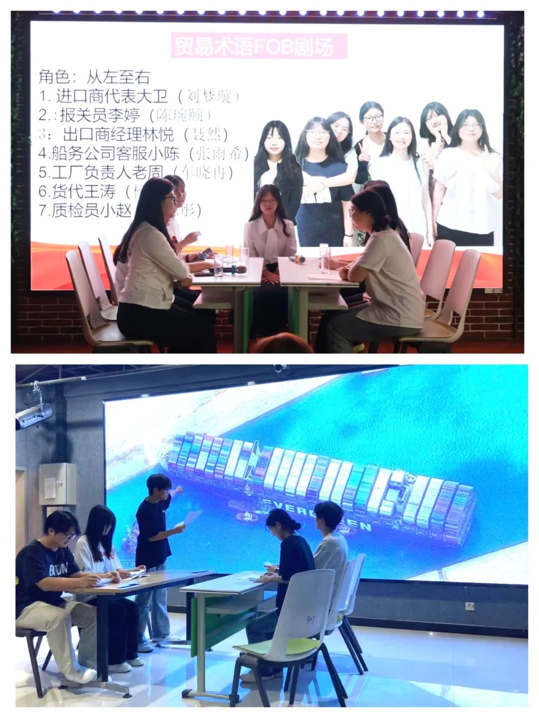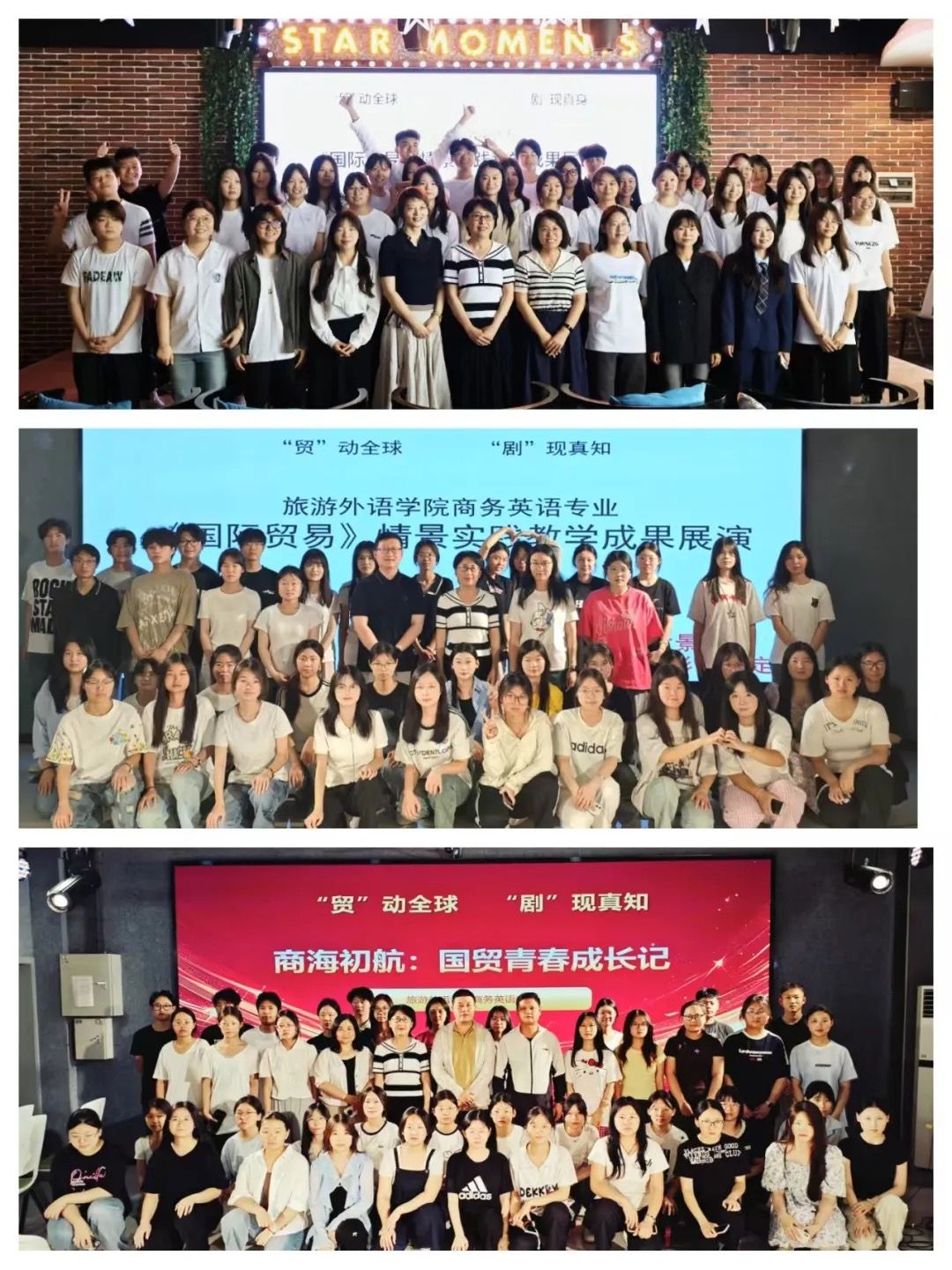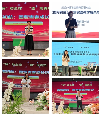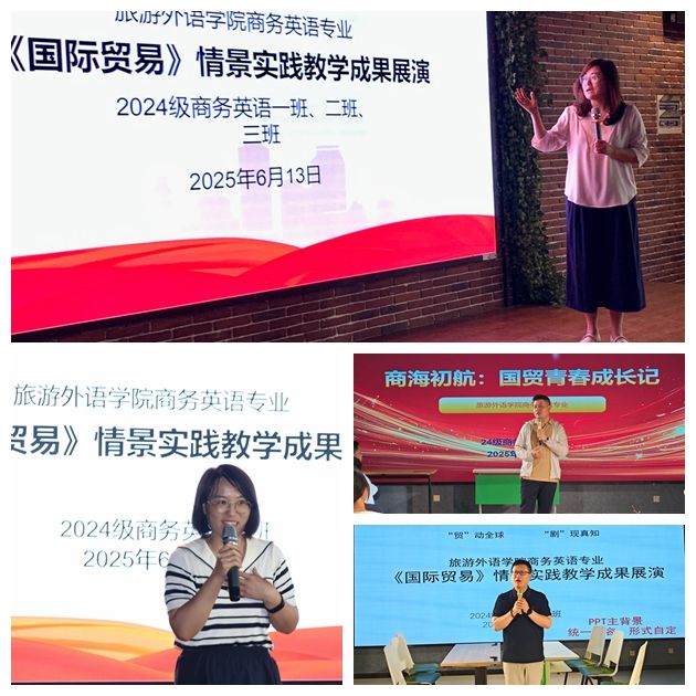 6月13日,旅游外语学院商务英语专业三个班以“‘贸’动全球 ‘剧’现真知”为主题,在综合实训室开展国际贸易情景实践教学成果展示活动。旅游外语学院副院长张丽君、商务英语教研室主任王萍、教学秘书徐慧以及礼仪教研室主任方颖、思政教师王阿敏、大学生职业发展与就业指导教研室负责人周晓辰,班主任李轶航、任重远、陈维等老师莅临现场,学生代表全程观摩。