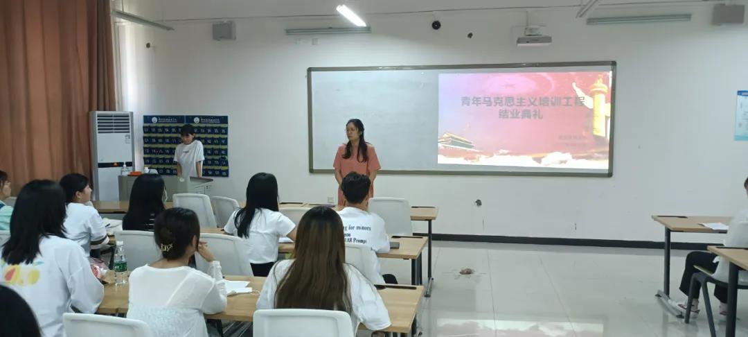 接着,由主持人邝鑫雨播放2020期青马工程学员为时一年的学习视频。视频中,大家一起从陌生走到熟悉,从理论课走到志愿服务,从飒爽秋日走到炎炎酷暑,最后在“愿你们保持这份热爱,继续奔赴下一场山海”的祝愿词中结束。典礼第二项议程,由主持人邝鑫雨宣读在时近一年的青马工程培训表现突出、积极进取的优秀学员名单。随后,由青马学员代表杨梦雨同学上台发言,分享了青马学习历程对自身带来的深刻影响,并表示作为一名社会主义事业的建设者和创新者,应该追求思想上的进步。只有把握了正确的行动方向,才能引导我们向正确的目标前进。典礼第三项议程,由团总支书记刘晓丹进行总结。刘晓丹书记希望同学要始终坚定理想信念,保持头脑清醒和政治自觉;树立远大理想,不做“躺平”的一代,做奋进的一代;把责任扛在肩上,做好带头模范作用。