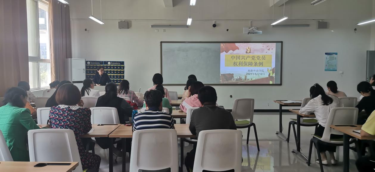 活动首先由旅游外语学院党总支纪检委员景艳老师带领大家学习《中国共产党党员权利保障条例》的主要章节和具体条例。随后党总支白娜书记做了总结发言,指出《中国共产党党员权利保障条例》以马克思列宁主义、毛泽东思想、邓小平理论、“三个代表”重要思想、科学发展观、习近平新时代中国特色社会主义思想为指导,增强了“四个意识”,坚定了“四个自信”,做到了“两个维护”,激发了广大党员的积极性、主动性和创造性,增强了党的创造力、凝聚力和战斗力。她建议旅游外语学院各个支部会后采用集中学习或自我学习的方式继续深入学习《中国共产党党员权利保障条例》,同时鼓励其他非党员教师对党员教师的各项工作做好监督。