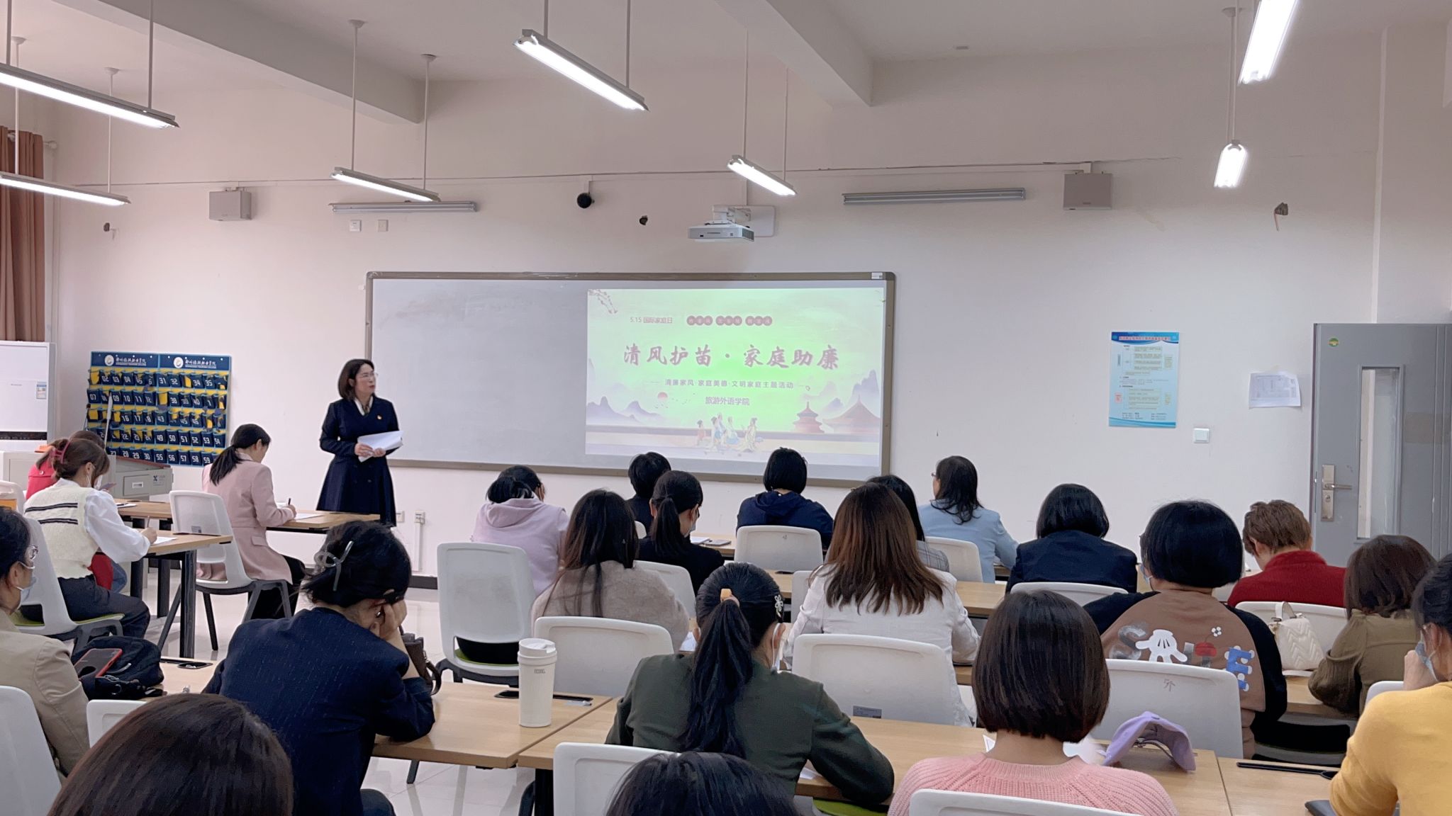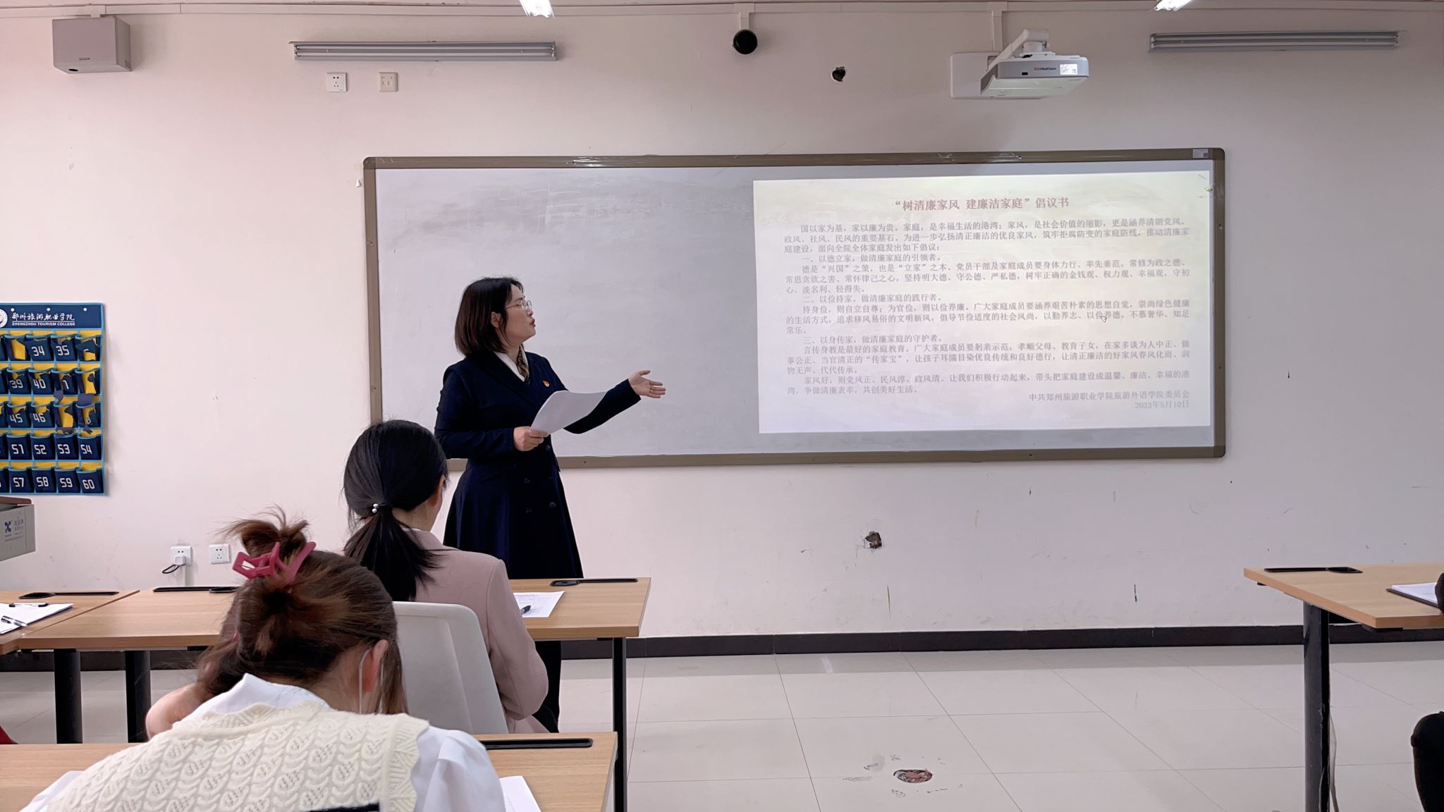 为深入贯彻落实习近平总书记关于注重家庭家教家风建设的重要论述,按照校纪委《关于开展2023年清廉宣传教育活动月的通知》要求,旅游外语学院于2023年5月10日在4B教学楼207开展“清风护苗·家庭助廉”主题活动。党总支书记白娜主持,全体教师、党员干部参加活动。