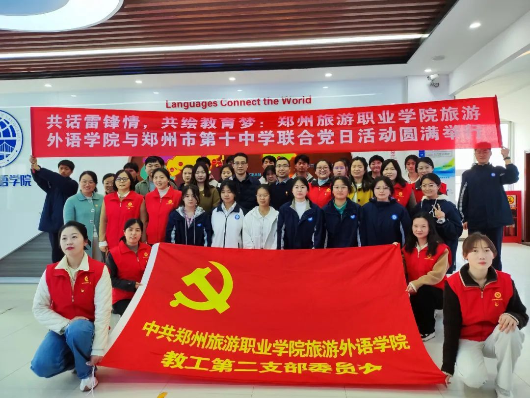 3月20日,旅游外语学院教工第二党支部与郑州市第十中学联合开展“共话雷锋情 · 共绘教育梦”主题党日活动。旅游外语学院党总支委员、教工第二党支部全体党员、郑州市第十中学高中党支部及两个班50名学生参与。活动由党支部书记常晓霞统筹安排,分为欢迎仪式、参观实训室、问答等几个环节。