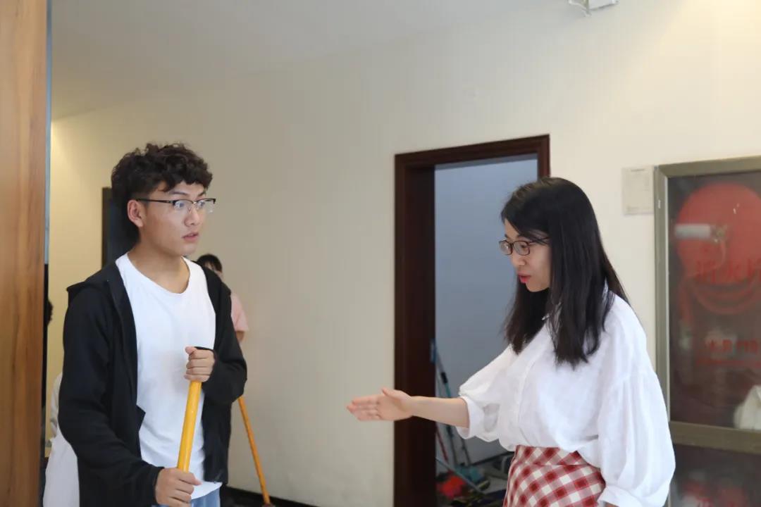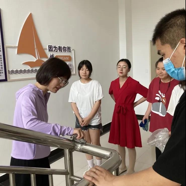 同学们拿着劳动工具来到了教室、楼道、走廊开始了分工明确的扫地、拖地、擦窗户、粘头发等工作,辛勤劳动的身影在盛夏高温的教学楼各个角落里穿梭。