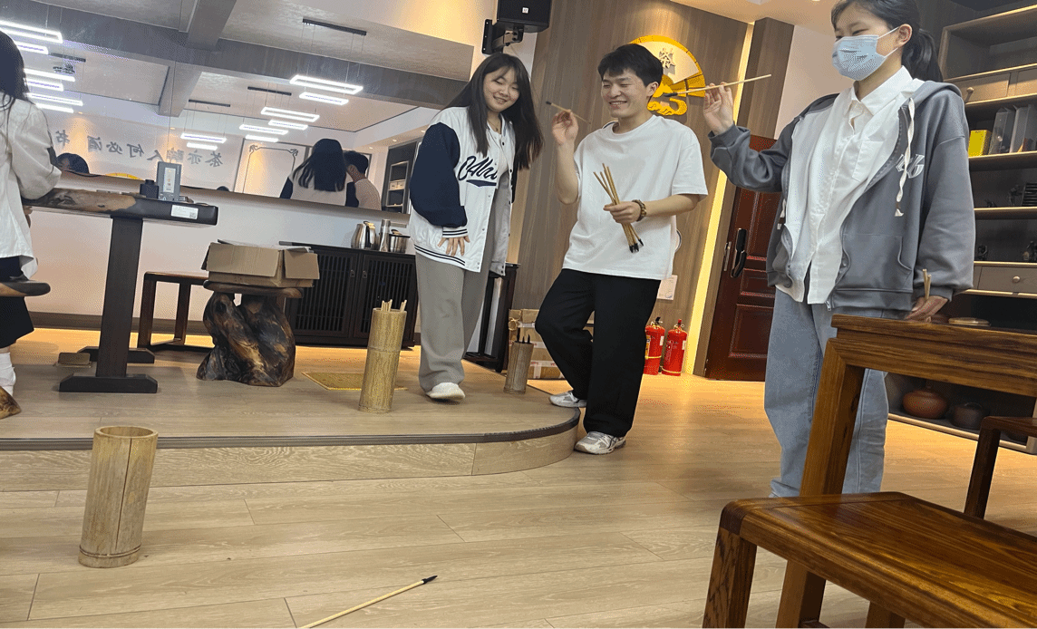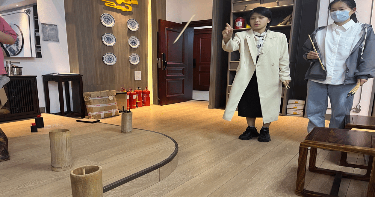 投壶是中国古代的一种投掷游戏,也是一项礼仪,源自于射礼,由射箭演变而来。比赛中,参与者需要在离壶一定距离的位置把箭向壶里投射,投中多者为胜。比赛现场,同学们热情高涨,或赢得掌声,或开心一笑,无论投中与否,都在过程中享受着轻松愉悦。