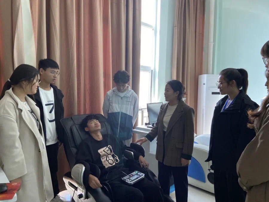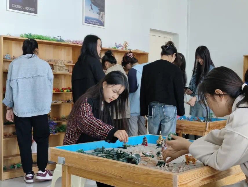 在心教中心讲解员的引领下,同学们参观了接待室、情绪宣泄室、心理沙盘室、心理咨询室以及团体辅导室等专业化的心理功能室。同学们不仅认识了不同类型的沙盘模具、放松宣泄仪器,还体验了按摩椅、心理沙盘、情绪宣泄解压等设备,初步了解了一些实用的压力管理、情绪调节方式。