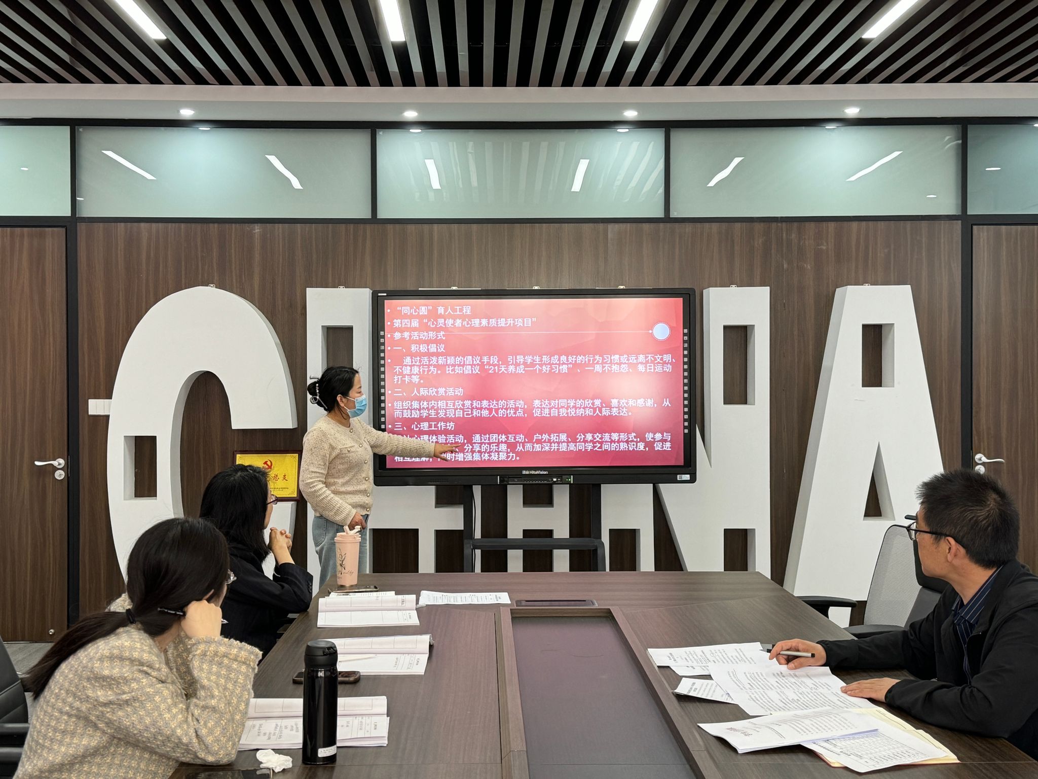 会上,首先由负责学院心理工作的刘平平老师传达学校心理健康教育工作重点及要求。一是重点关注学生心理健康访谈和档案记录的工作要求。二是“同心圆”育人工程第四届心灵使者项目的工作要求。然后,在座老师就近期心理工作疑点、难点进行交流讨论。