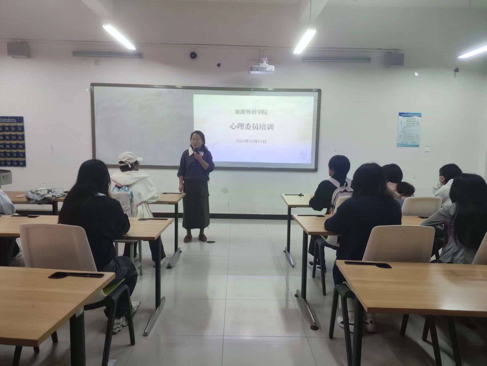 为加强大学生心理健康教育工作的实效,进一步提升心理委员的专业素养,培养一批具备专业心理素养和优秀沟通能力的心理委员,为学院心理健康工作注入新的活力, 10月11日,旅游外语学院在清源楼207教室召开了24级心理委员培训会。24全体级心理委员参加,学院心理辅导站刘平平老师做培训。