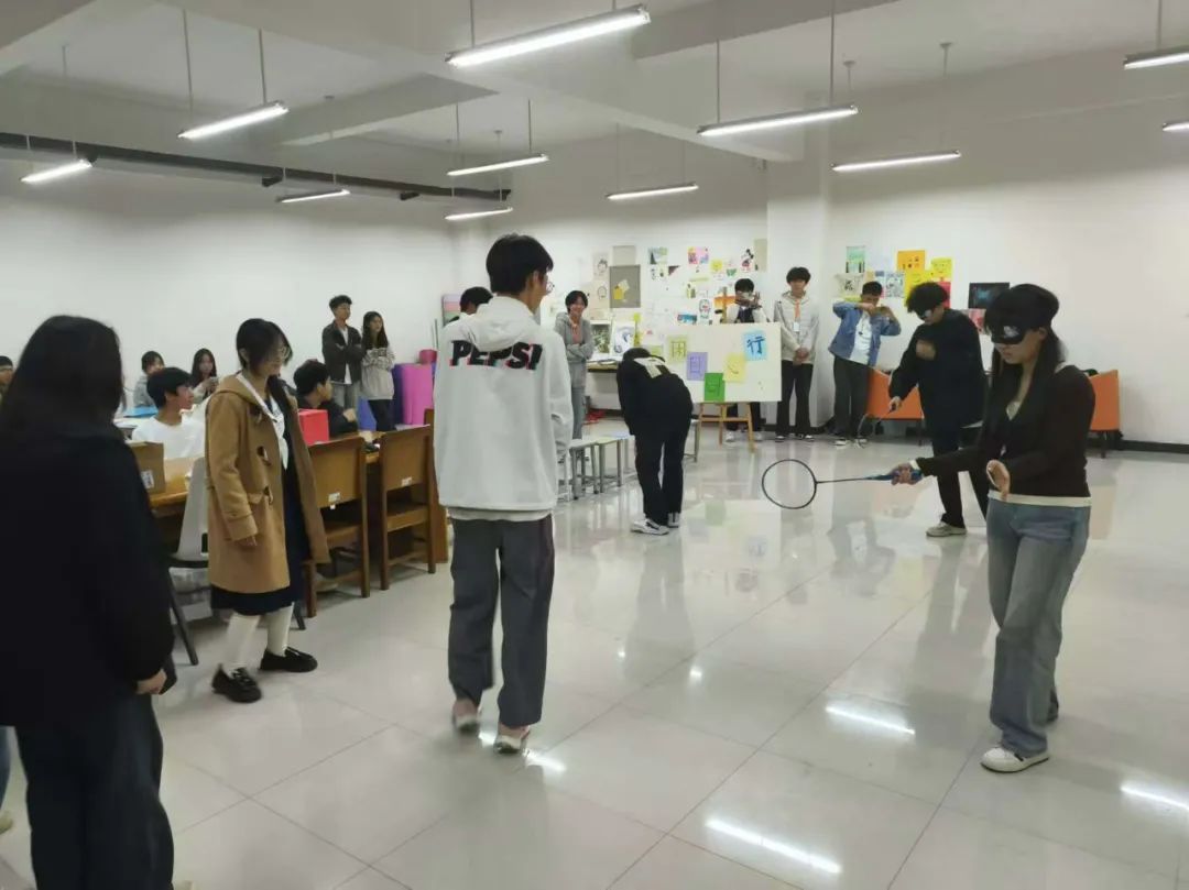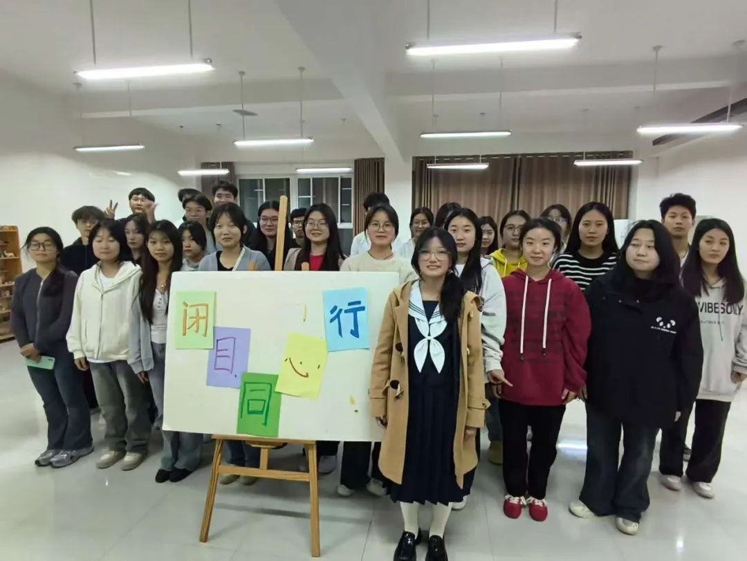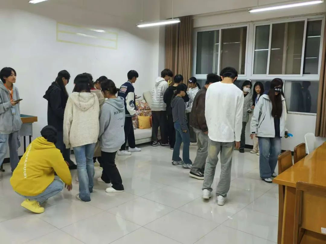 首先,参与者随机抽签分为4个小组,每组7人。活动共有三个环节。在“闭目同心行”心理活动中,学生们经历了一场别开生面的团队协作挑战。他们首先被随机分组并蒙上眼罩,在规定区域内展开寻宝之旅,需避开隐藏的“炸弹”并比拼找到的物品数量;随后,各组组长蒙眼,手持特殊道具,在限定时间内与队员进行了一场惊心动魄的摸人竞赛,考验着他们的默契与信任;最终,根据心教部提供的图片,各组组长迅速指挥组员摆出相应姿势,以速度最快且准确无误者胜出,为这场活动画上了圆满的句号。