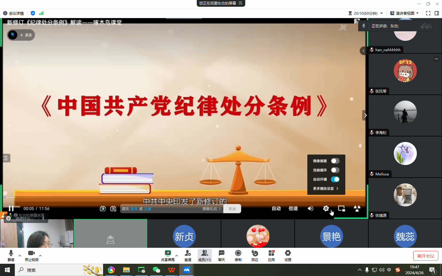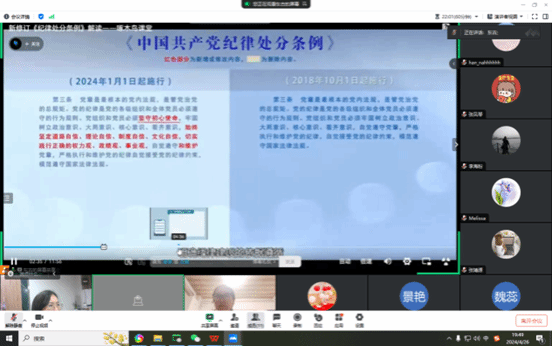 4月26日,旅游外语学院教工第一党支部在线上组织开展了《中国共产党纪律处分条例》专题学习活动, 深化师德师风建设,提升教师的政治素养和纪律意识。旅游外语学院党总支书记肖磊,教工第一党支部全体党员参加会议。