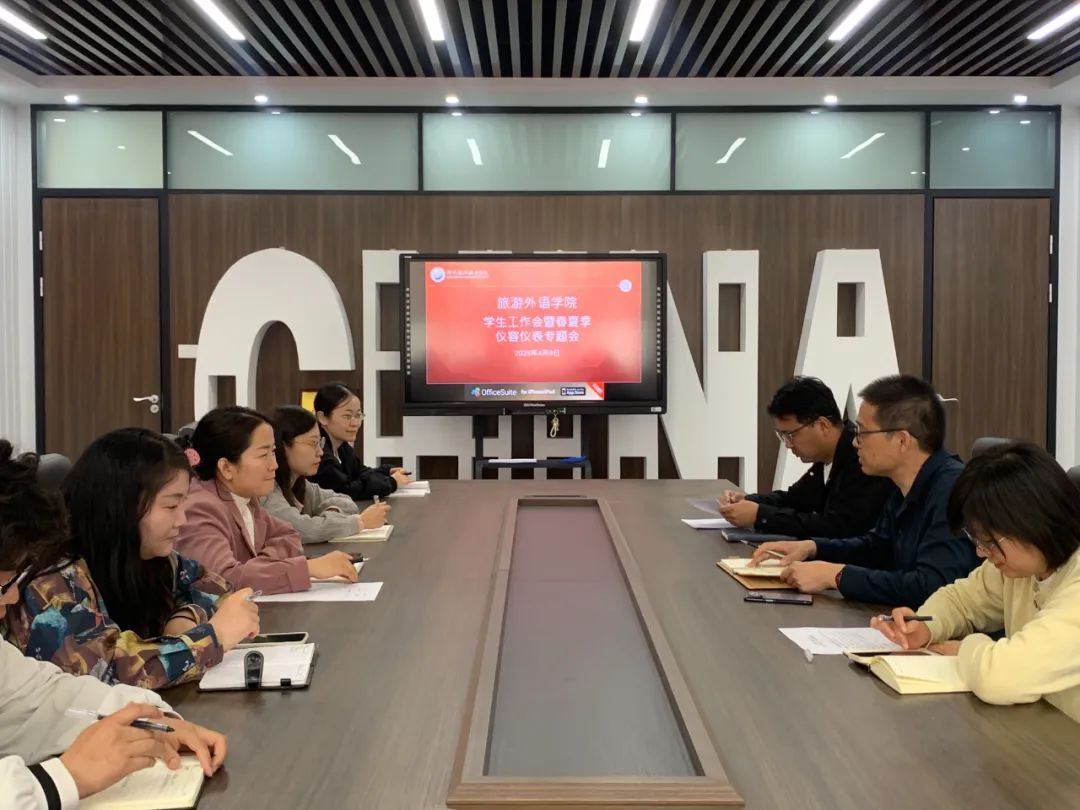 为加强学生日常管理,规范行为习惯,提升育人实效,4月9日,旅游外语学院召开学生工作会暨春夏季学生仪容仪表专题会。学院党总支书记肖磊、团总支书记刘晓丹、学工办代主任沈晋旭及全体专兼职辅导员参加会议。