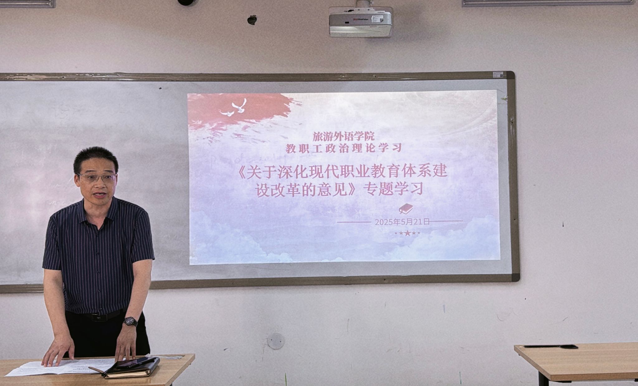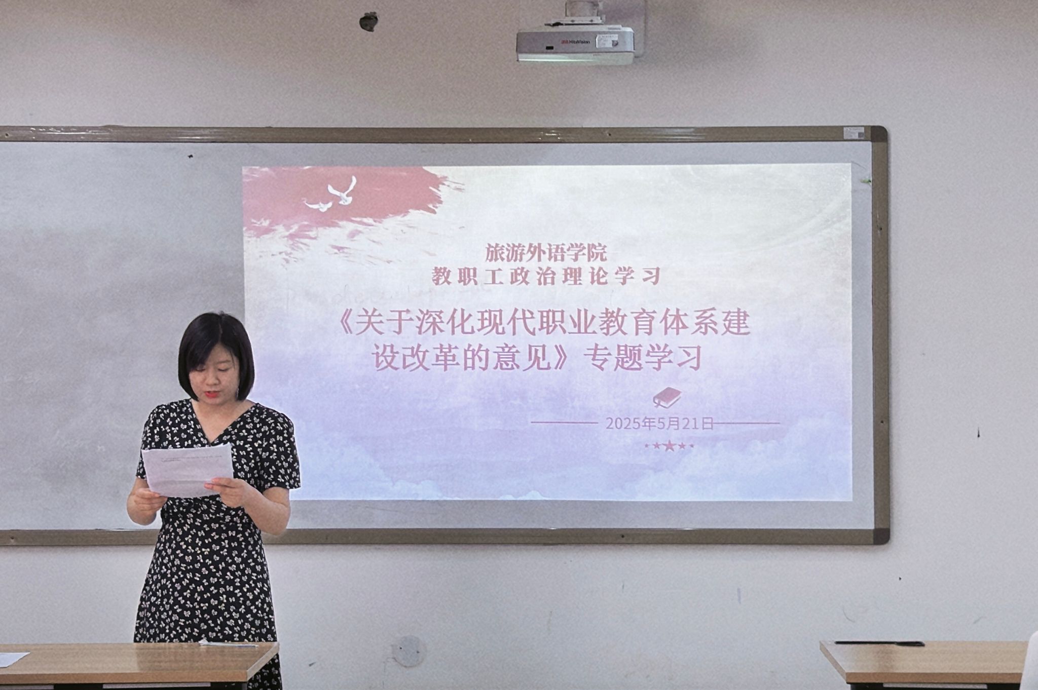 为深入贯彻落实党的二十大精神,加快推进现代职业教育高质量发展,5月21日,旅游外语学院在清源楼207教室召开专题政治理论学习会,深入学习《关于深化现代职业教育体系建设改革的意见》。学院党总支宣传委员刘晓丹领学,全体教职工参加学习。