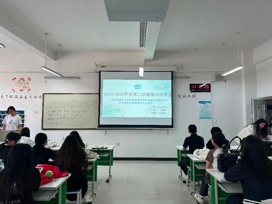 为引导学生树立文明离校意识,强化假期期间安全防范观念,保障学生离校及假期生活的安全有序,旅游外语学院于6月23-24日在清源楼组织各班开展了“文明离校,平安度假”主题班会。此次班会通过丰富多样的形式,切实将文明离校理念与安全知识传递给每位同学,班级全体成员积极参与其中。