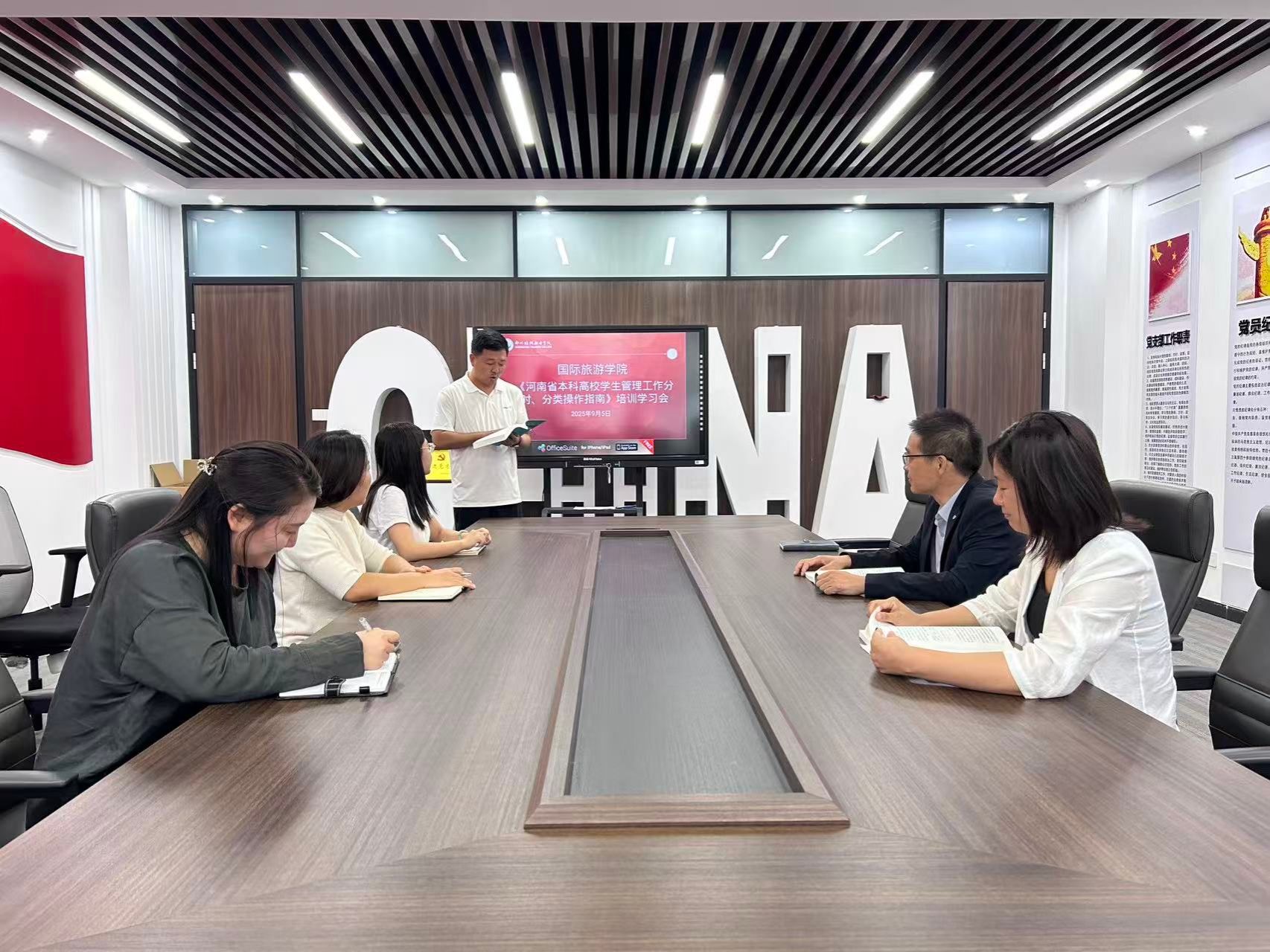 为落实河南省本科高校学生管理工作要求,提升规范化管理能力,国际旅游学院于9月5日在党员活动室召开《河南省本科高校学生管理工作分时、分类操作指南》培训学习会。学院党总支书记肖磊、团总支书记刘晓丹、学工办代主任沈晋旭及全体辅导员参会。
