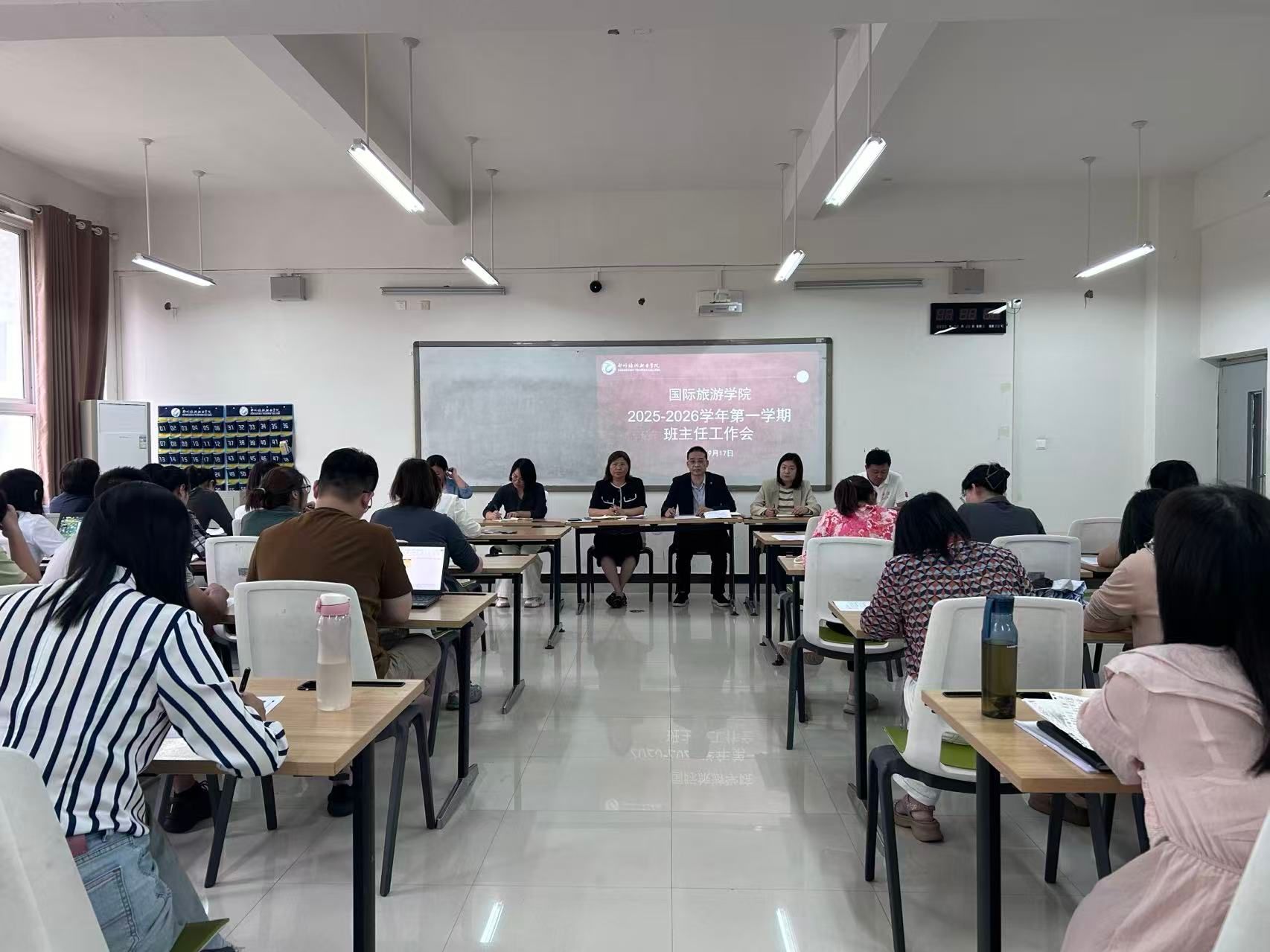 为统筹推进新学期学生管理与育人工作,明确班主任职责分工,9月17日,国际旅游学院在清源楼207教室组织召开2025-2026学年第一学期班主任工作会。学院党总支书记肖磊、副院长张丽君、团总支书记刘晓丹、学工办代主任沈晋旭及全体班主任参加会议。