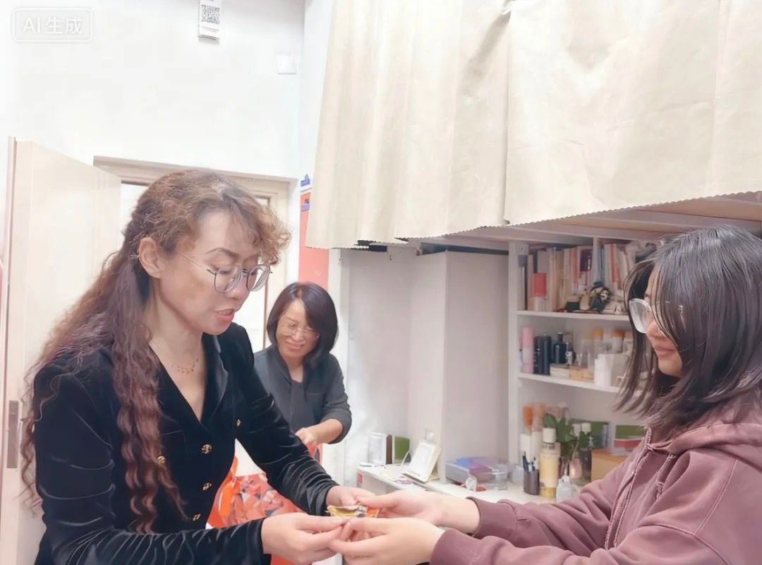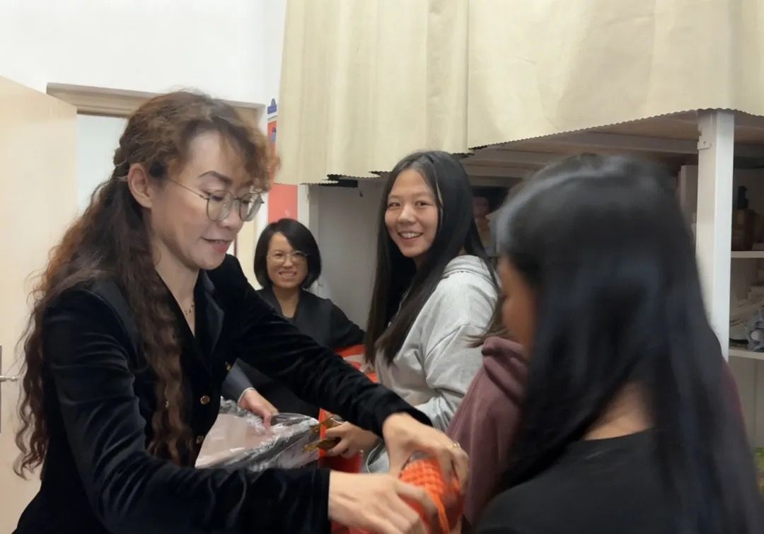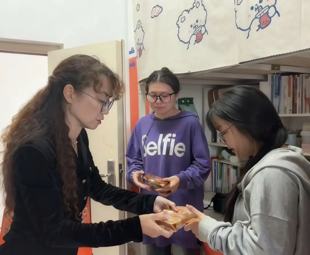 随后,毛艳将月饼、水果等慰问品逐一递到学生手中。拿到饱含心意的慰问品,同学们脸上满是笑容,纷纷向校领导和老师表达感谢。来自24级商务英语专业的学生张同学说道:“虽然今年没能回家,但学校的关怀让我们感受到了浓浓的节日氛围,特别温暖。”