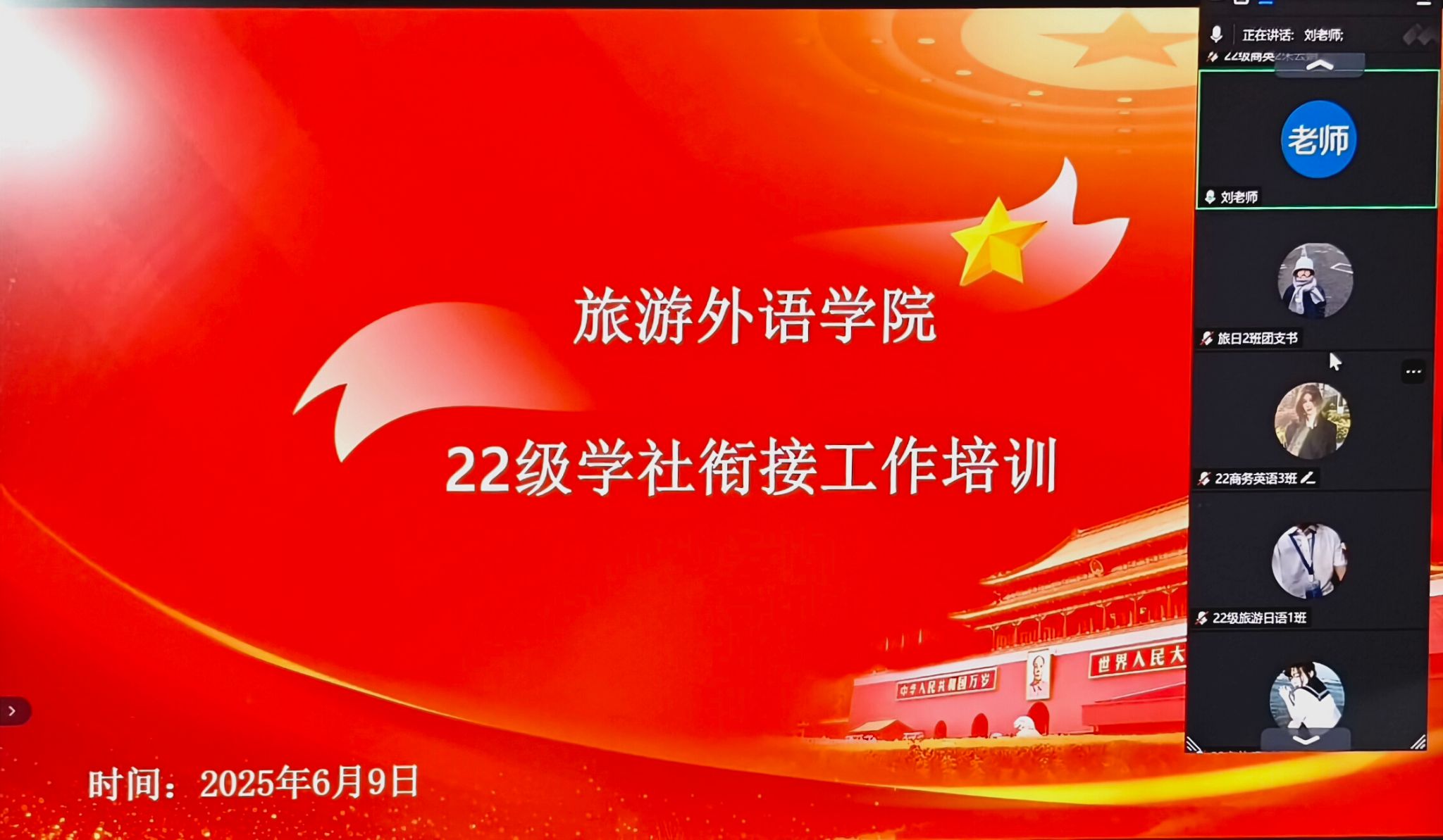 为扎实推进基层团组织规范化建设,助力毕业生团员顺利完成团组织关系转接,6月9日,旅游外语学院以线上形式召开2025届毕业生团关系转接(学社衔接)工作培训会。本次会议由学院团总支总书记刘晓丹主持,毕业班全体团支书参会。