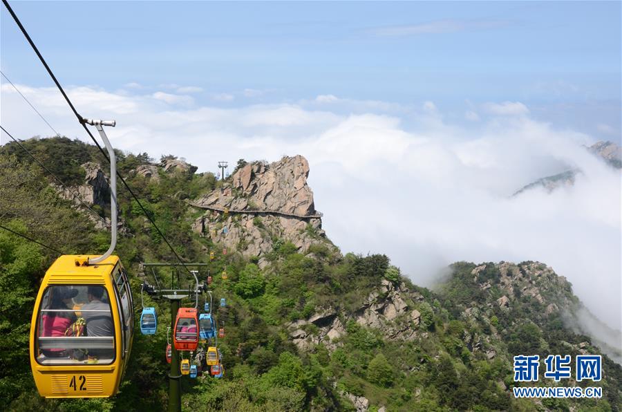 5月5日,游客乘坐索道在位于山东省临沂市平邑县的蒙山龟蒙景区游览。 据文化和旅游部的统计数据,5月1日至5日,全国共计接待国内游客1.15亿人次,实现国内旅游收入475.6亿元。 新华社发(武纪全摄)